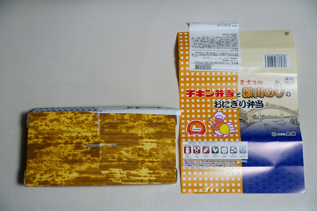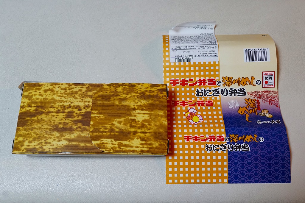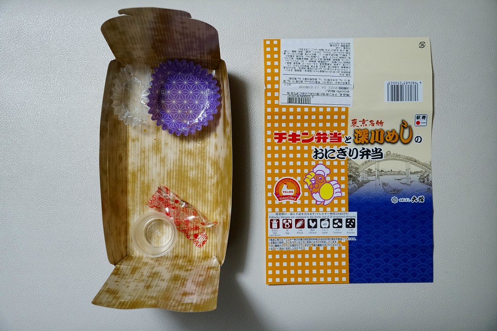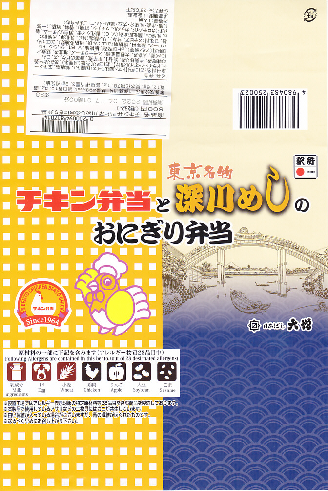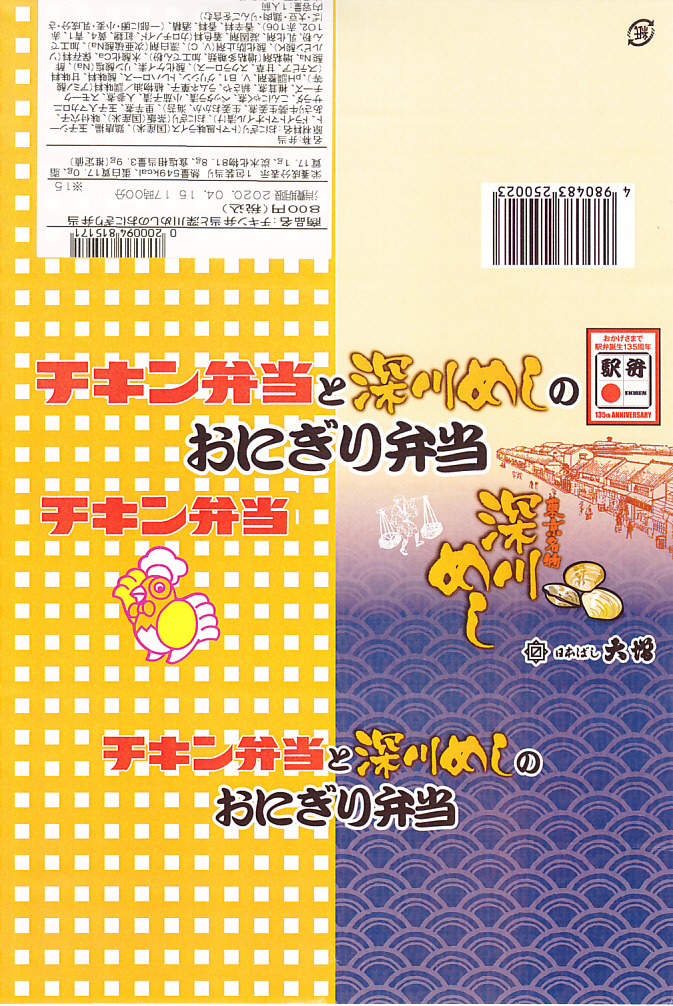 2020(令和2)年4月15日に購入した、東京駅弁の掛紙。その発売理由と内容は、上記の2022年の「チキン弁当と深川めしのおにぎり弁当」のとおり。絵柄は2020年当時のチキン弁当の箱と深川めしのふたからきており、上記の2022年のものと少し異なる。容器は同じ、中身はほぼ同じ。
