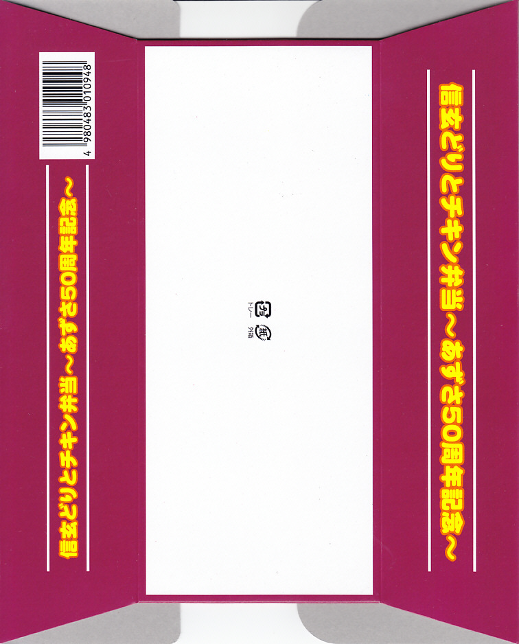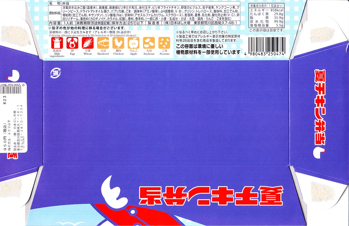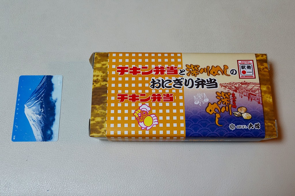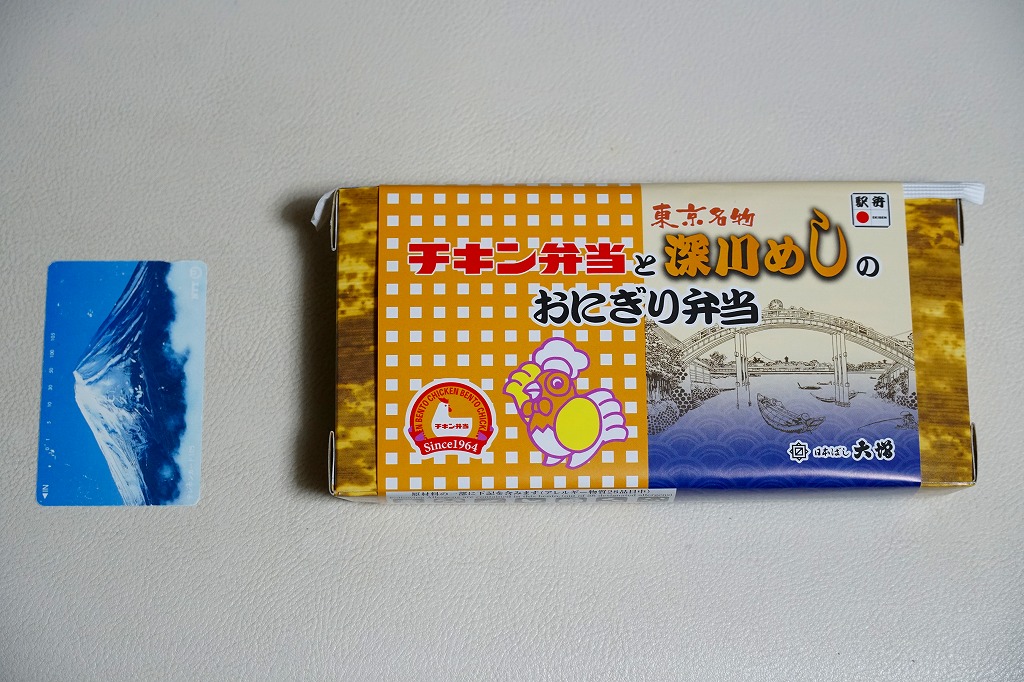 2020(令和2)年4月15日に購入した、東京駅弁の掛紙。その発売理由と内容は、上記の2022年の「チキン弁当と深川めしのおにぎり弁当」のとおり。絵柄は2020年当時のチキン弁当の箱と深川めしのふたからきており、上記の2022年のものと少し異なる。容器は同じ、中身はほぼ同じ。