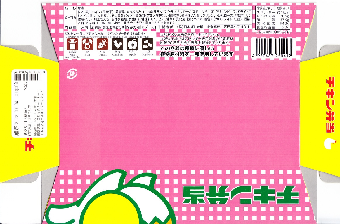 2022(令和4)年3月に販売。この月は通常版に代えてこれを販売。初めて出たのではないかと思われる、東京駅弁チキン弁当の春バージョン。いつものオレンジ色のバスケット紙箱がサクラ色になり、ニワトリのイラストに桜花の飾りを付けた。中身のうちトマト風味ライス、スクランブルエッグ、ドライトマトオイル漬け、グリーンピースのトレーは変わらず、鶏唐揚、スモークチーズ、レモン果汁パックも同じで、野菜のピクルスに代えてキャベツとコーンのサラダに蝶々型のニンジンを載せ、桜の色と形をしたバランで彩った。
