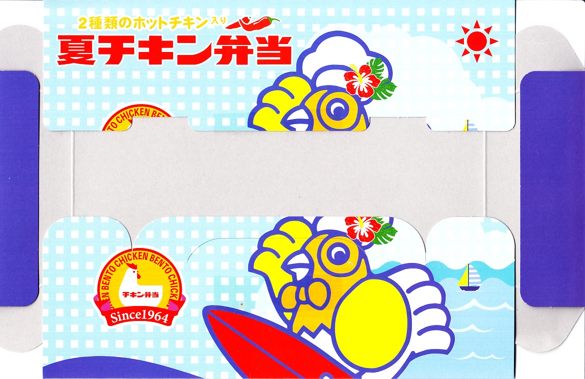 2022(令和4)年7月21日に初めて発売、8月まで販売。東京の名物駅弁「チキン弁当」の夏バージョンで、通常版と併売された。バスケット型の容器の構造を変えずに、箱の色を海と空で青くし、名無しのニワトリがサーフボードに乗る。中身は御飯が、カレー風味とする洋風炊き込み御飯にドライトマト、茄子揚煮、ヤングコーン、パプリカ、グリーンピース、味付玉子を載せるもの。おかずが、通常版とピリ辛たれ和えの鶏唐揚とフライドチキン、野菜のピクルス。いつものチキン弁当とは似て非なる鶏駅弁。