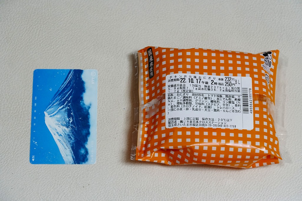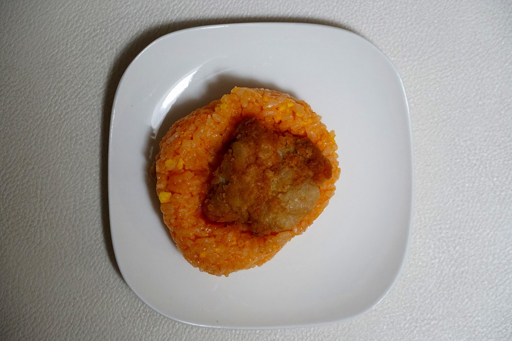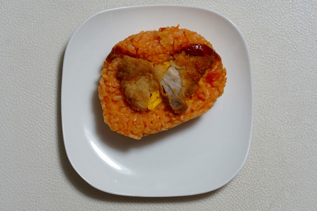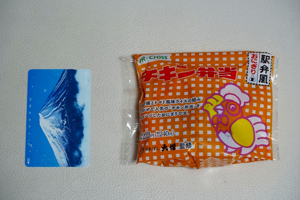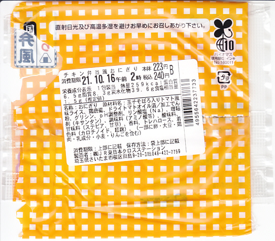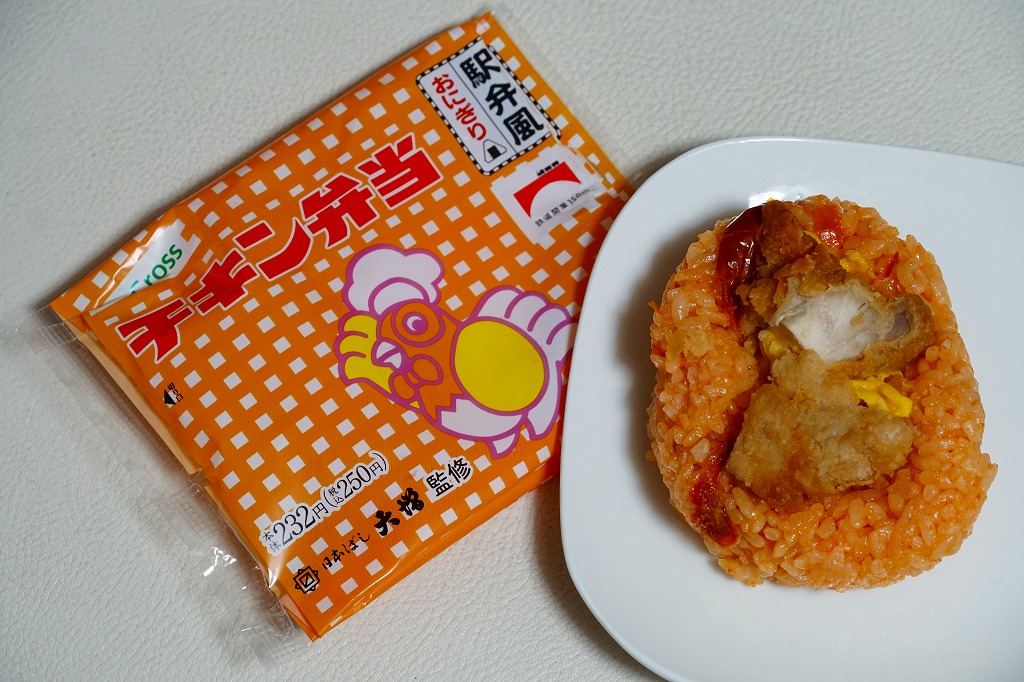 これは東京駅弁の日本ばし大増が監修し、埼玉県のJR東日本クロスステーションが製造し、駅のコンビニで販売する、自社完結の企画商品。駅弁のチキン弁当と同じ地柄とニワトリを描いた袋に、トマト味飯に鶏唐揚と半熟卵を仕込んだおにぎりを詰める。チキン弁当の、確かな味。