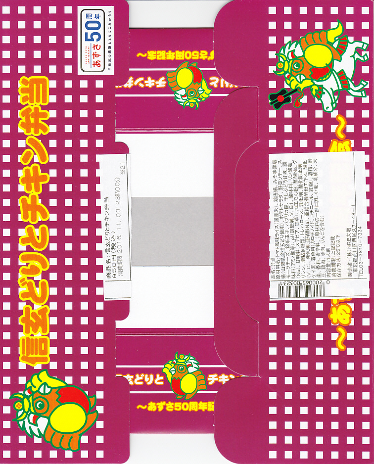 JR東日本の駅弁キャンペーン「駅弁味の陣2016」の新作駅弁として、2016(平成28)年9月29日から11月30日まで販売。同キャンペーンでは甲府駅の駅弁として出てきたが、調製元はNRE大増であり、実態は東京エリアの駅弁である。食品表示ラベルで文字が隠れたが、中央本線特急「あずさ」の運行開始50周年を記念している。