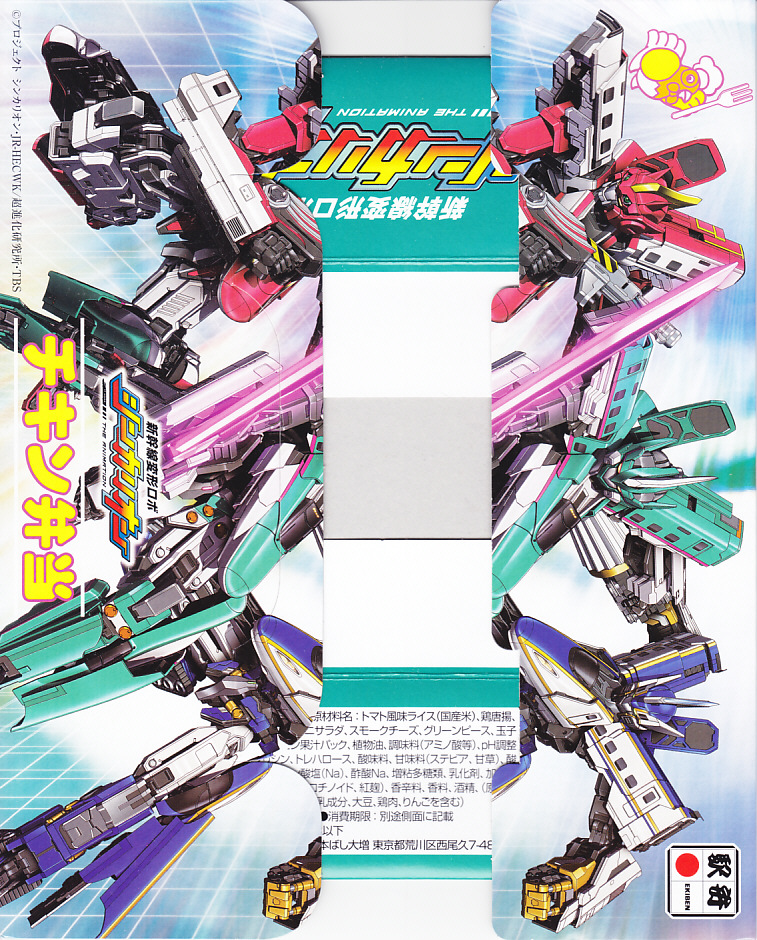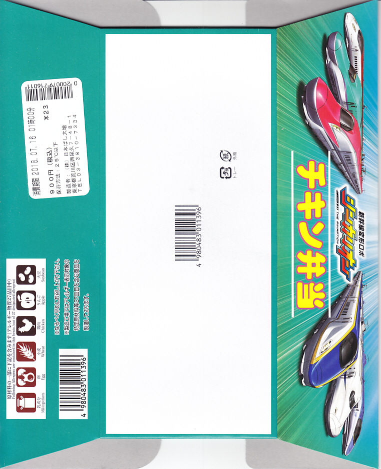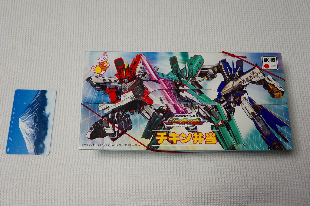 2018(平成30)年7月15日に購入した、東京駅弁のパッケージ。東京駅弁「チキン弁当」について、2018(平成30)年7月14日から期間限定で、パッケージの絵柄を「新幹線変形ロボ シンカリオン」にしたものが販売された。中身や値段は通常版と同じ。2015年から小学館の漫画雑誌「てれびくん」で連載され、2018年からTBS系列でテレビアニメになり、この駅弁が作中に出てきたという。調製元は2018(平成30)年3月までのNRE大増。