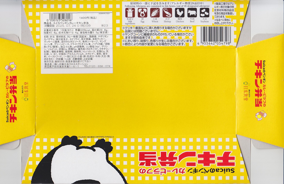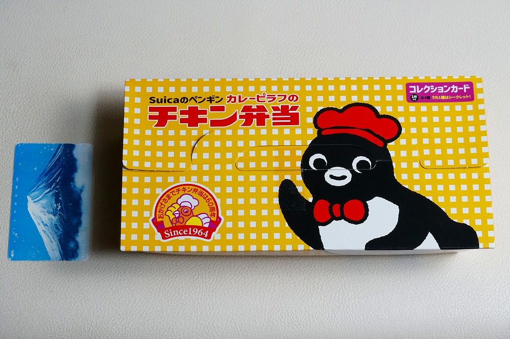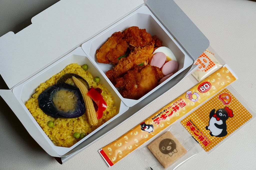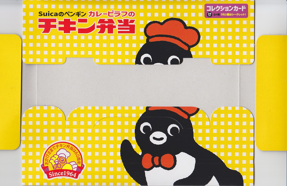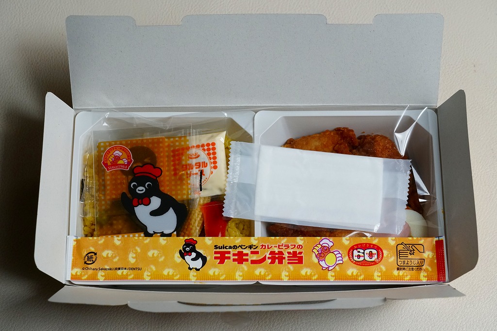 容器のつくりは、普段のチキン弁当と同じ。オレンジ色が薄くなった紙箱ではSuicaのペンギンがポーズを決め、箸袋では普段のチキン弁当のニワトリも一緒に描き、Suicaのペンギンのプリントクッキーと4種類中1枚のコレクションカードを添付した。中身は片方が彩り野菜のカレーピラフ、片方が鶏唐揚、エビフライ、ゆで玉子、タルタルソース、Suicaのペンギンの好物とする魚肉ソーセージのせナポリタン。おいしい洋食の記念駅弁。