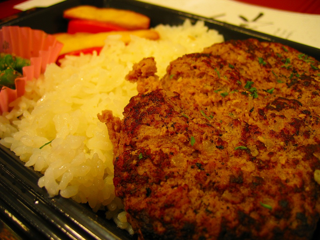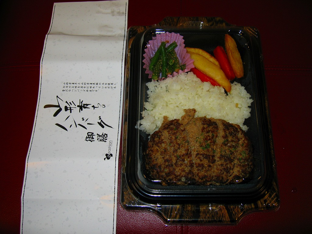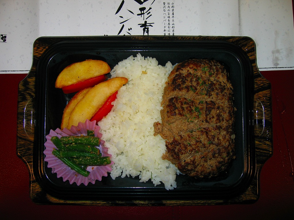 2007(平成19)年10月25日の東京駅地下1階商業施設「グランスタ」のオープンと同時に発売か。鉄板焼プレート風のプラ製トレーに透明な上げぶたをして、商品名を書いた掛紙を巻く。中身は白御飯、ハンバーグ、ポテト、ニンジン、インゲンという、ガチなファミレス風ハンバーグステーキ。山形県産の牛肉と黒豚を使ったそうで、ハンバーグのジューシーさは駅弁にないもの。一方でデパ地下弁当らしくて駅弁らしくないとも言える。