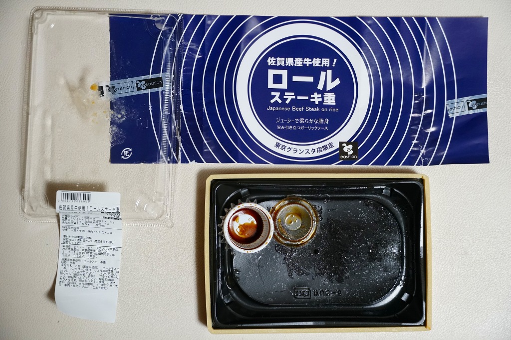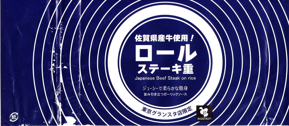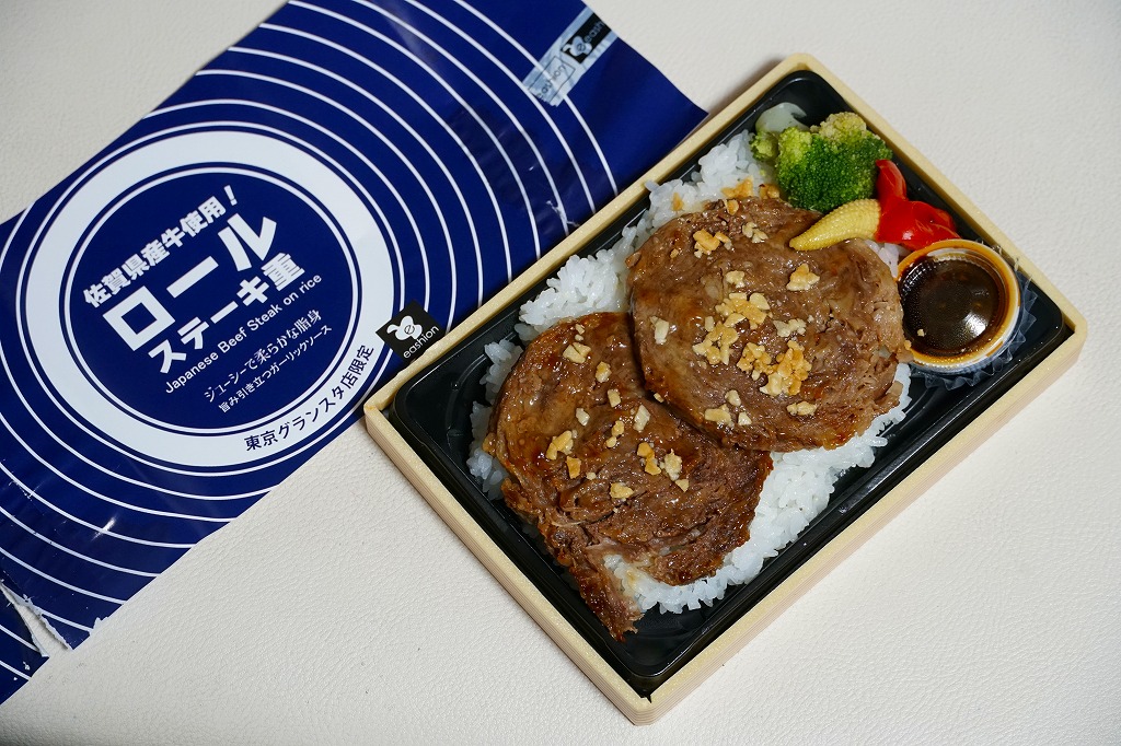中身の見栄えを確保しながら上げ底の工夫で内容量を削減しコストを抑えられることを売りとする商材である、今時の惣菜弁当向けプラ容器に、商品名と同心円を描く青い掛紙を巻く。この容器に白飯を薄く塗り、薄くスライスした佐賀県産牛をミルフィーユのように1枚1枚ロール状に巻いて焼き上げたロールステーキを2枚貼り、フライドガーリックを振り、ヤングコーン、ブロッコリー、パプリカ、ガーリックソースなる醤油だれのカップを添える。牛ステーキには思えないけれど、焼肉の味と香りがする平たいハンバーグが面白い、駅弁屋で売られる駅弁にない味。