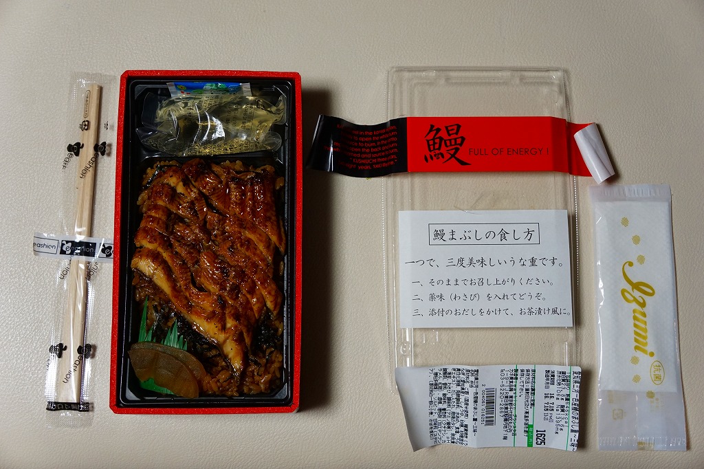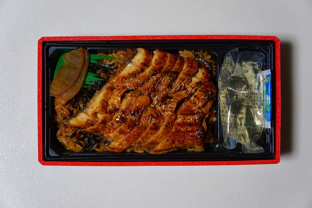 東京駅構内の商業施設「グランスタ」で買えたお弁当。2014年頃から土用の丑の日の頃にのみ販売か。紙帯には「鰻」としかないが、食品表示での商品名は「愛知県三河一色産鰻のまぶし重〜三味〜」。ここでイベリコ豚重が大当たりした、eashionの商品。タレでどす黒くなった御飯を、これまた濃い色のウナギ蒲焼きで覆う。ふたに貼り付けた「鰻まぶしの食し方」のとおり、名古屋名物のひつまぶしのような食べ方を推奨し、そのためのワサビの小袋と、だしの大袋を詰める。ヤワな容器と、分量もタレもたっぷりの飯とウナギを見ると、そのまま鰻丼として食べ切りたくなる。ウナギはまるで鶏照焼スライスのような形状で千切りにされ、実分量以上のボリューム感があった。