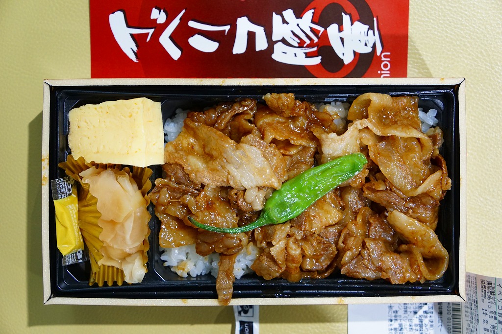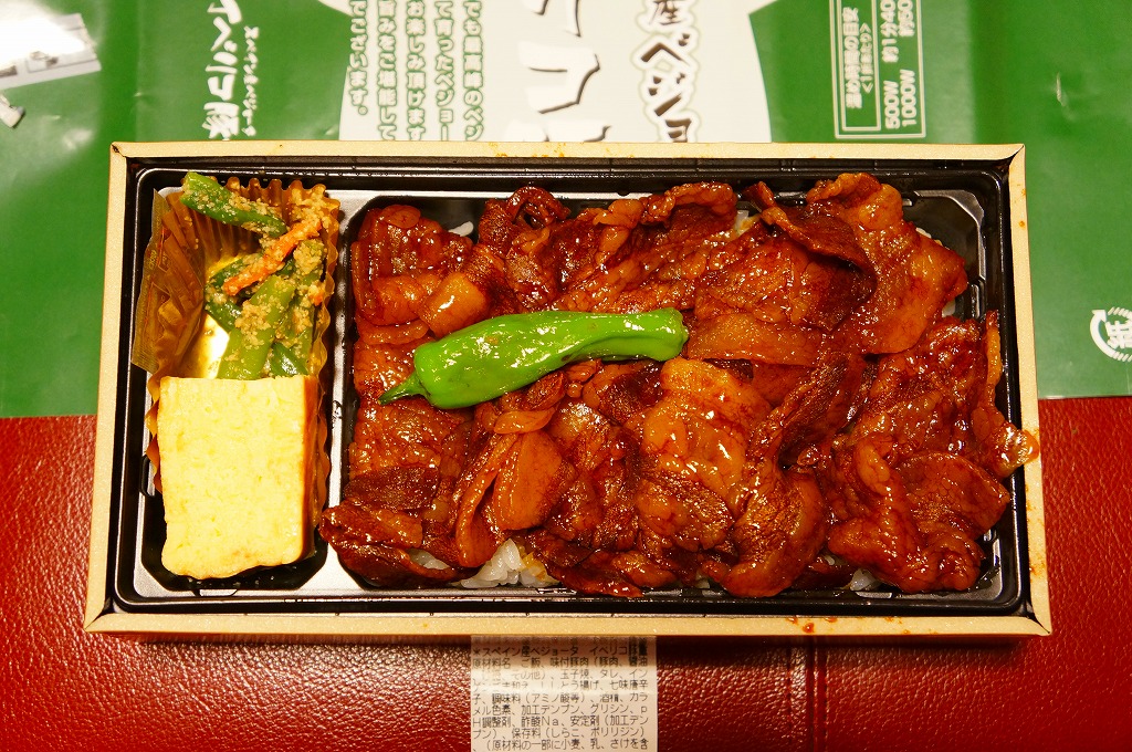 2007(平成19)年10月25日にオープンした東京駅構内の商業施設「グランスタ」の地下食品売り場で、2009年までに発売されたお弁当。駅弁でもデパ地下弁当でも使われるタイプの、黒いトレーを接着した長方形の容器に透明なふたをして、商品名と宣伝文を印刷した緑色の掛紙を巻く。中身は白御飯の上を豚焼肉で覆い、インゲンのごま和えと玉子焼を添えるもの。