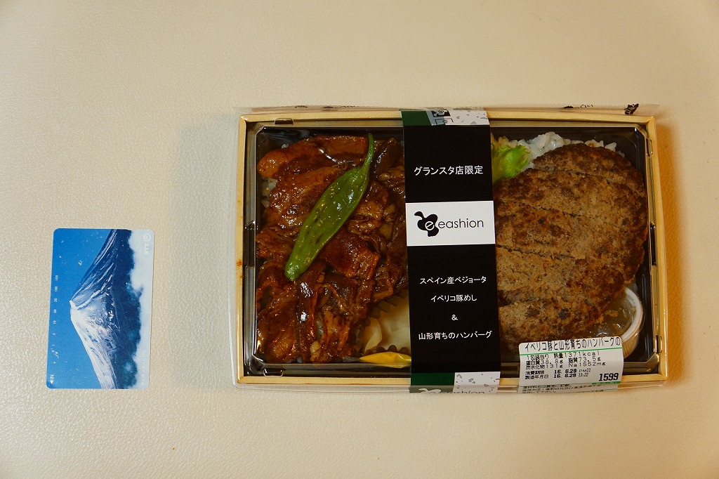 東京駅構内の商業施設「グランスタ」地階の食品売り場で販売されているお弁当。ふたつの区画を持つ容器の両側に白御飯を詰め、一方に味付豚肉を、もう一方に牛肉ハンバーグを載せる、豚丼とハンバーグ丼の組合せ弁当。ここの人気商品「スペイン産ベジョータイベリコ豚重」と同じ場所でともに販売。スペイン産ベジョータイベリコ豚重の部分は同じ味で、山形育ちのハンバーグも、控えめなビーフと焼きの香りに、ふわふわないしボソボソの固め方が、味と食べやすさで白御飯と車内食に合う感じ。