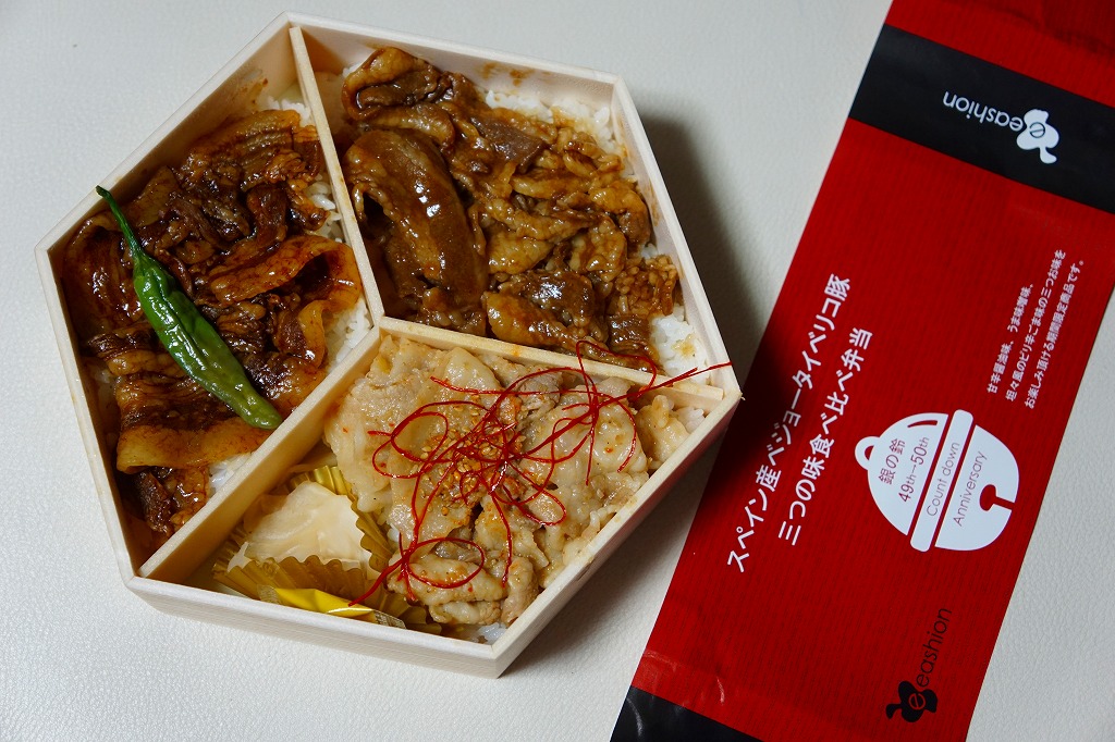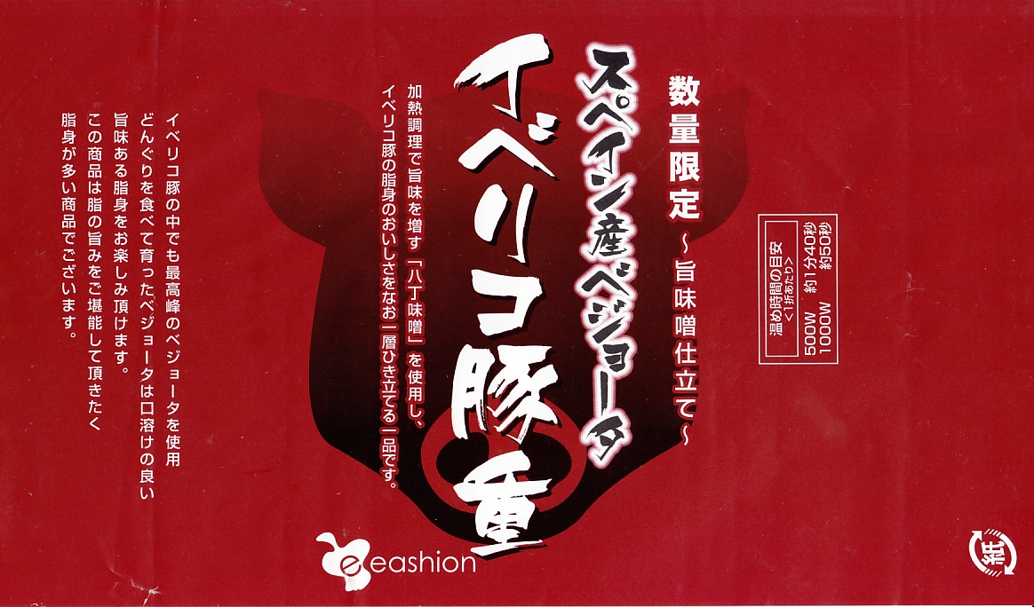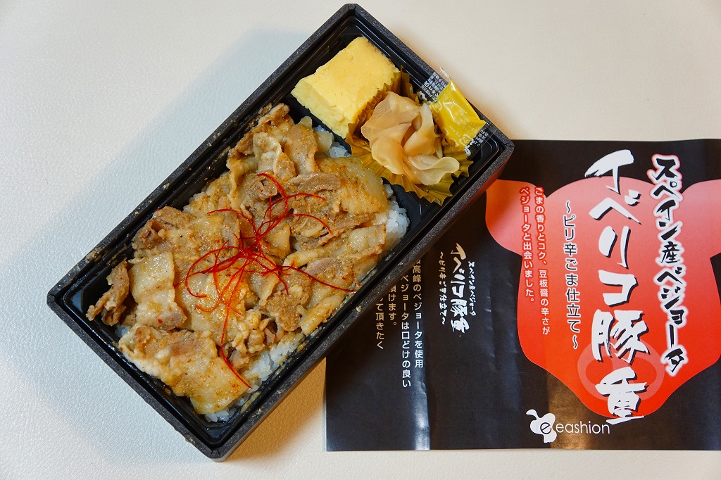東京駅のデパ地下で一番人気の弁当「スペイン産ベジョータイベリコ豚重」の別バージョン。下記の通常版のタレ味の掛紙を、緑色から赤黒く変え、味付けを八丁味噌にした。商品名と、にゅるにゅるした豚肉の豚丼であることに、変わりはない。