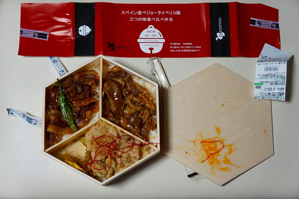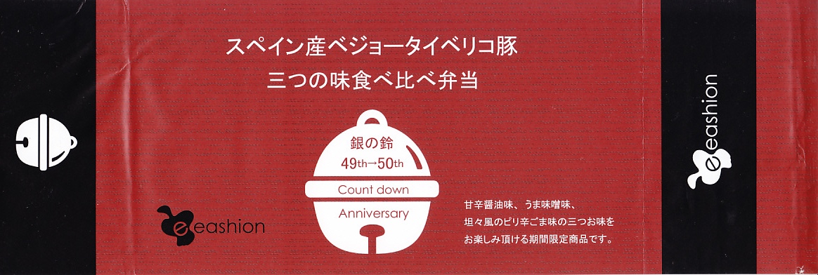 東京駅の待合せ場所シンボル「銀の鈴」の設置50年を理由に、2017(平成29)年6月1日から18日まで東京駅構内の商業施設「グランスタ」で展開されたキャンペーン「銀の鈴フェア」の期間中に販売されたお弁当。正六角形の容器に、商品名とフェアの鈴のマークを描いた掛紙を巻く。中身は豚丼が3等分で3種類。甘辛醤油煮、うま味噌味、坦々風のピリ辛ごま味で、ここでの人気駅弁「スペイン産ベジョータイベリコ豚重」が入る。ここのいつもの味で違う風味な、豚丼づくしのお弁当。