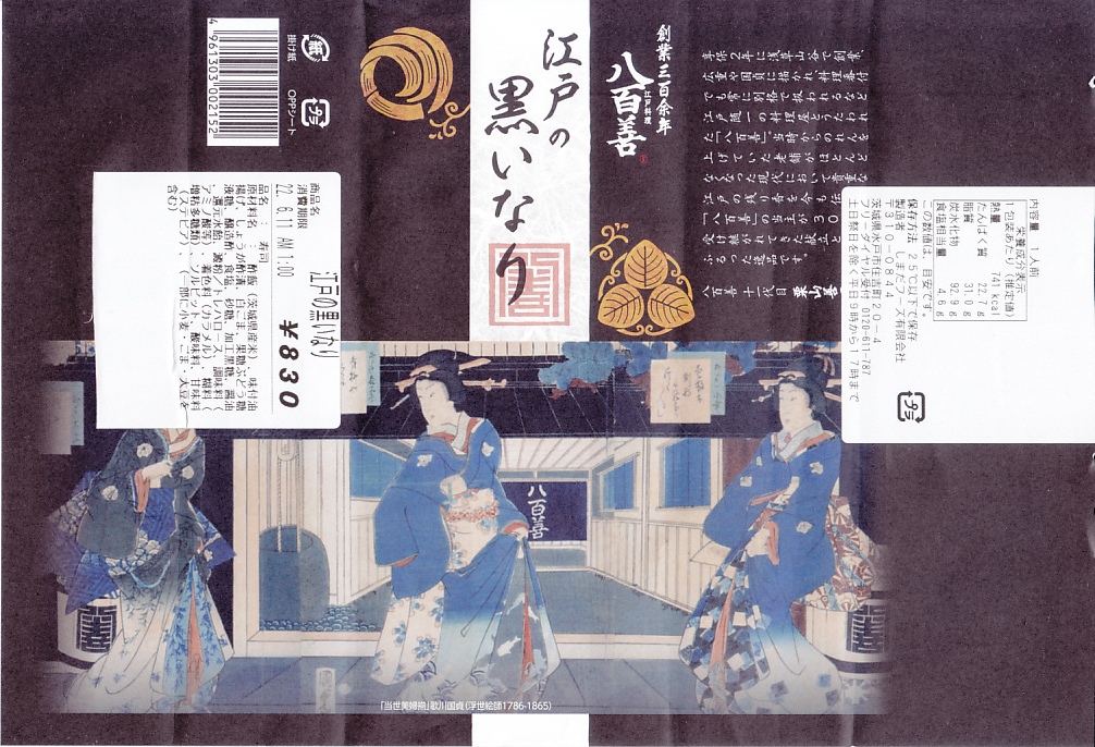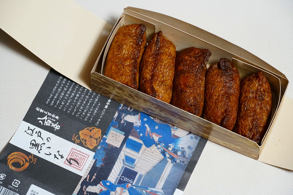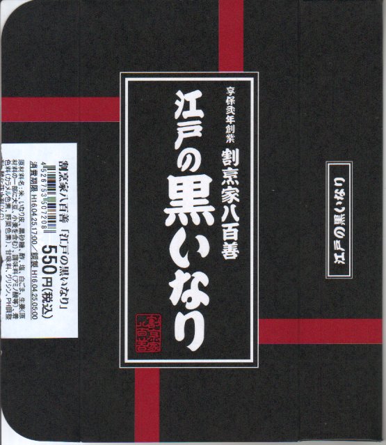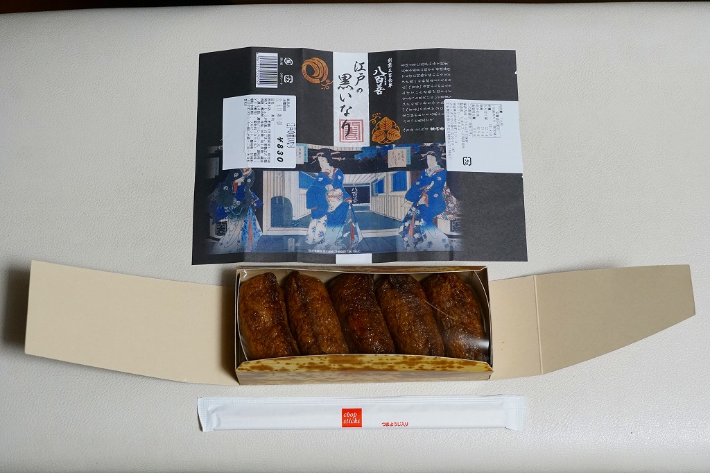 2022(令和4)年の春に東京駅などの駅弁売店「HANAGATAYA」で発売か。下記のとおり18年前にも同じ名前と中身の商品が発売されており、久々の再登板となった。黒い掛紙で創業三百余年江戸料理「八百善(やおぜん)」を名乗り、調製は水戸駅弁のしまだフーズとなっている。中身は黒い稲荷寿司が5個。生姜酢漬と白ごまを混ぜた酢飯を、黒糖で炊いたらしい油揚げに詰める。それ以外は何も入れない、袋詰めの甘酢生姜や紅生姜や醤油のようなものも入らない、シンプルすぎる商品。味の癖はなくなり、甘辛の辛はないが甘すぎることもない、食べやすいおいなりさん。