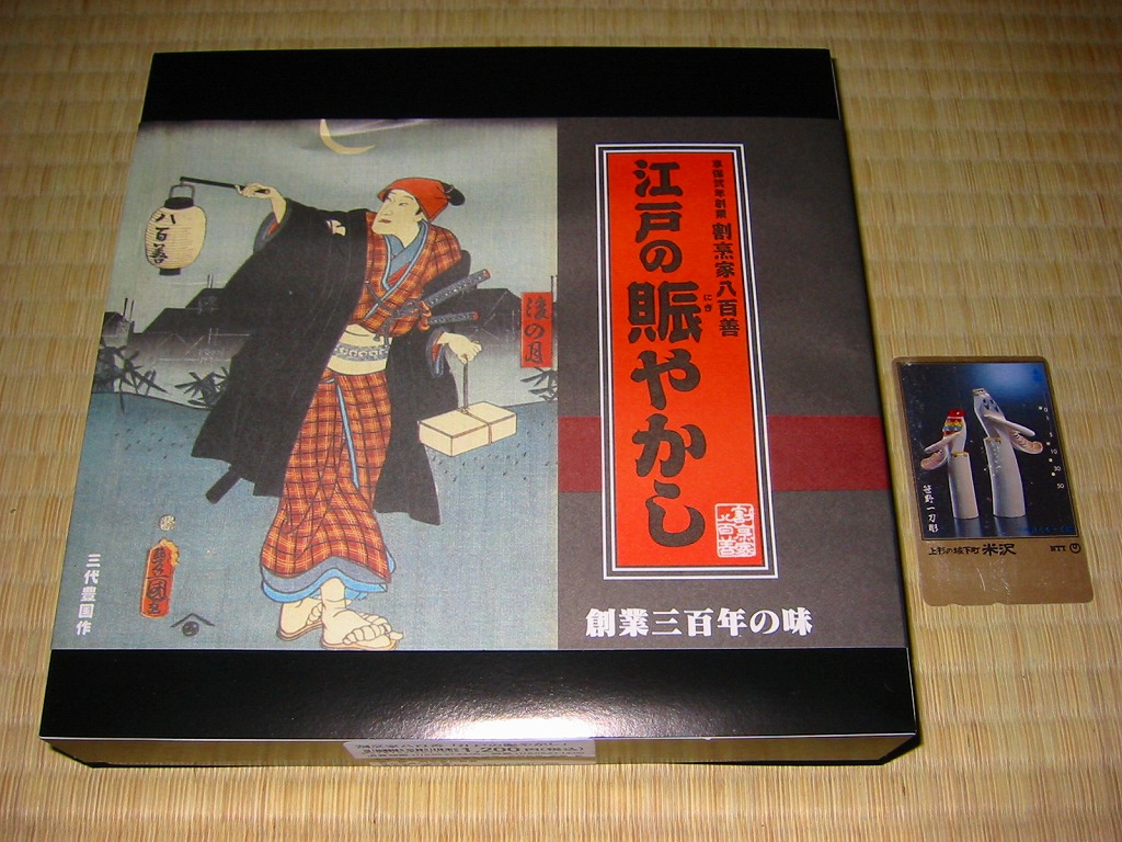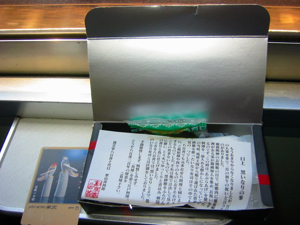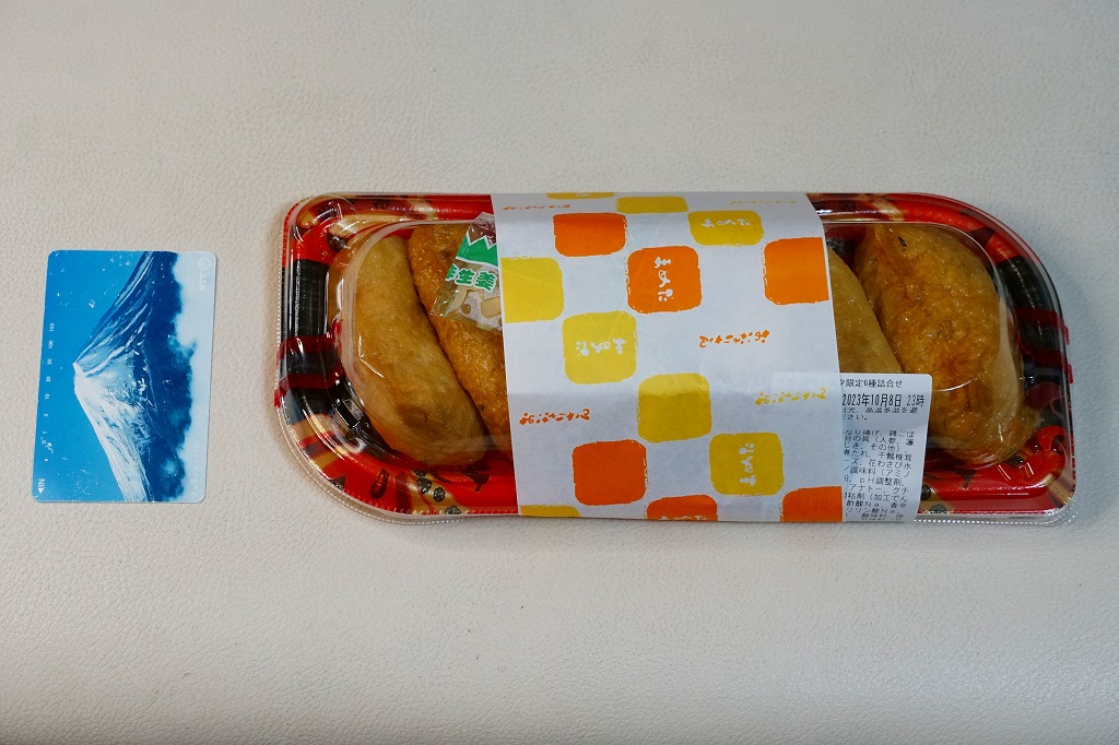 2004(平成16)年3月26日の発売。十代三百年続く都内の割烹屋「八百善(やおぜん)」が監修した、黒砂糖を使ったいなりずし。8センチ×16センチの小さな紙箱に黒糖色のおいなりさんが4個入り550円。味は黒かりんとうをなめたような黒糖の甘さが強く、万人受けするものではないかもしれない。同封のしおりによると、江戸で琉球王国産の貴重な砂糖を使い二月の初牛の稲荷明神開帳日に親戚知人に振る舞ったものだという。東日本キヨスクの弁当売店「膳まい」での取り扱い。数年間の販売か。