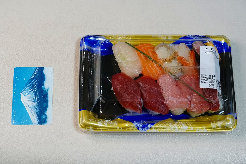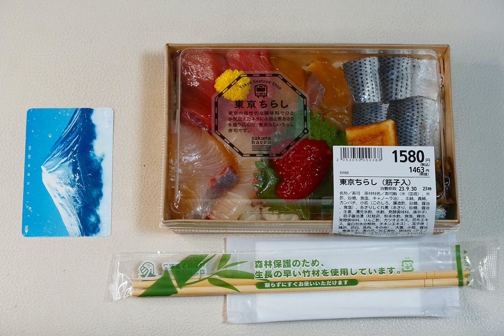 東京都心でチェーン展開する持ち帰り寿司店が、東京駅限定で販売する商品のようで、商業施設の出入口にそんな宣伝看板が出ていた。同店の品川駅限定商品と違い、見た目が駅弁らしくないものの、よく見ると商品名のシールに鉄道の地図記号や電車の顔がみえるから、駅売りを意識した商品だと思われる。筋子でなく魚の味と量で、値段に納得。価格は2023年の購入時で1,580円、2025年時点で1,680円。