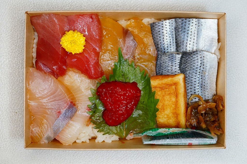 東京駅の駅構内商業施設「京葉ストリート」には2022年4月に入居したテナント「サカナバッカ」で買えた惣菜弁当。デパ地下で見られるような、ふたが透明の長方形容器に酢飯を詰め、マグロ、マダイ、カンパチ、コハダの切り身で覆い、あさりしぐれ煮、大葉に載せた筋子醤油漬、玉子焼を添える。刺身で酢飯を覆い尽くした、高級か豪華なちらしずし。