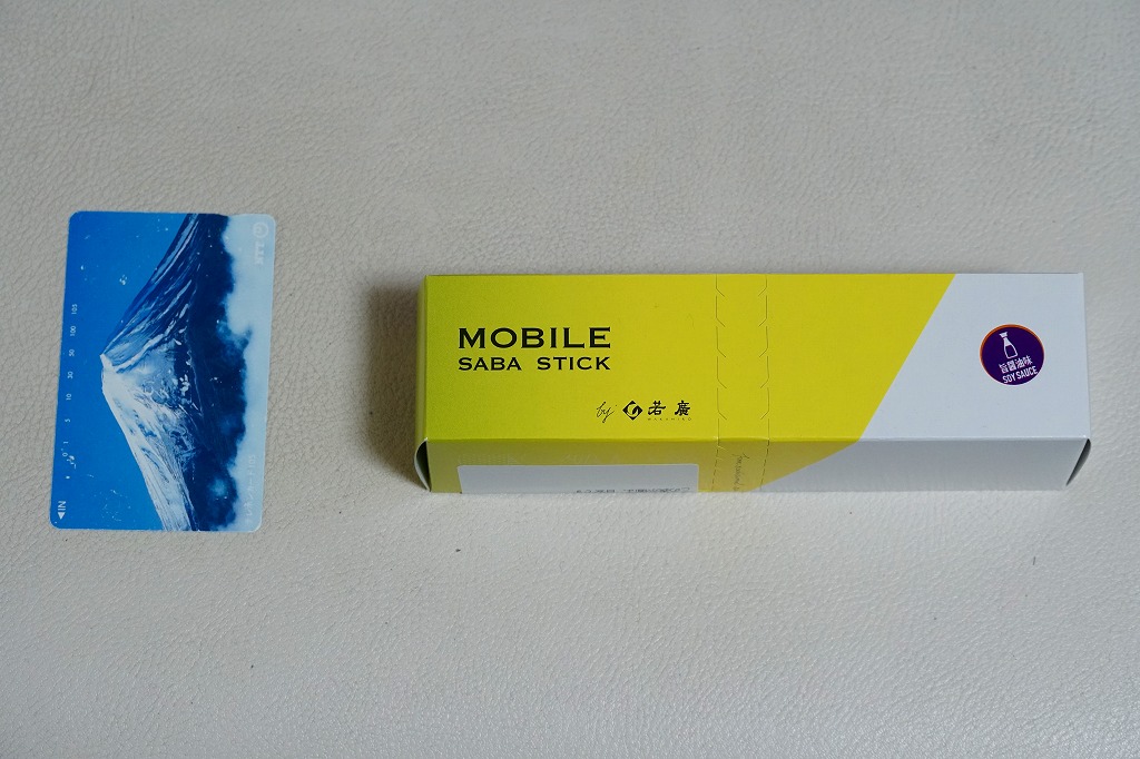 2020(令和2)年3月に東京駅の商業施設「グランスタ」地下1階の食品売り場に店舗を設けた若廣(わかひろ)が、この店舗限定で販売し始めた商品。中身は同店で主力の焼きサバ寿司であり、酢飯に焼きサバを貼り付ける。そんな中身をおおよそ想像できない、細身で小さなボール紙箱には「MOBILE SABA STICK」とあり、食品表示ラベルの商品名は「鯖スティック(醤油)」、シールとレシートには「旨醤油味」とあった。