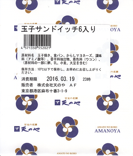 2015年か2016年頃から東京駅の駅弁売店で売られるようになったサンドイッチ。1932(昭和7)年創業の麻布十番の甘味屋「天のや」が、2015(平成27)年から関東地方各地のデパートの食品売り場で売り始めたタマゴサンド。調製元のロゴマークを印刷した専用の紙箱に、パンにだし巻き卵のみを挟んだサンドイッチを3切れ分詰める。