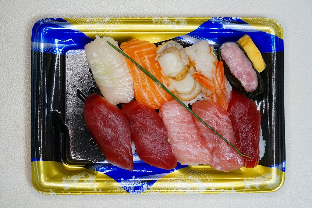 東京駅の商業施設「グランスタ」地下1階で売上ランキング常連という、ここに入居する持ち帰り寿司店「築地竹若」が、東京駅グランスタ限定で販売する商品。中トロ2貫をはじめとしたマグロのにぎり5貫、甘エビ、サーモンなど人気のネタ10貫と卵焼き入りのセットが1,680円、というのが公式な宣伝文。文字上では東京駅の駅弁のように思えて、しかし商品そのものは駅弁にはとても見えないお惣菜。デパ地下の持ち帰り寿司と同じく、普通においしい握り寿司だった。調製元が2024年1月5日限りで東京駅から撤退し、今は駅では買えない。