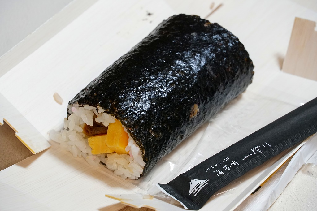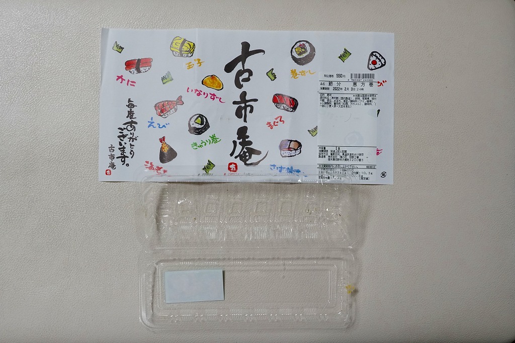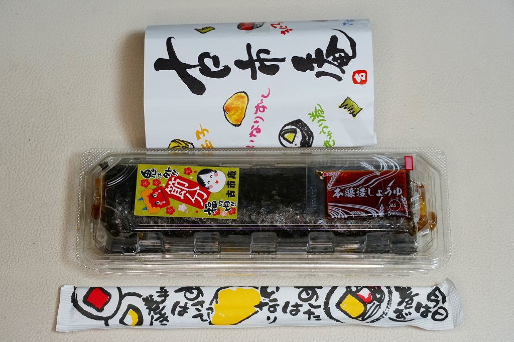 海苔巻き1本を収めた透明なプラ容器に、節分のシールを貼り、ブランドの掛紙を巻く。中身は酢飯、玉子焼、しいたけ、かんぴょう、きゅうり、おぼろを海苔で巻いたもの。奇抜や個性は見あたらない、普通のお惣菜。2000年代以降の恵方巻ブームが過熱のうえ定着し、この日の東京駅のエキナカでも各店舗が盛大に恵方巻を積んでいた。