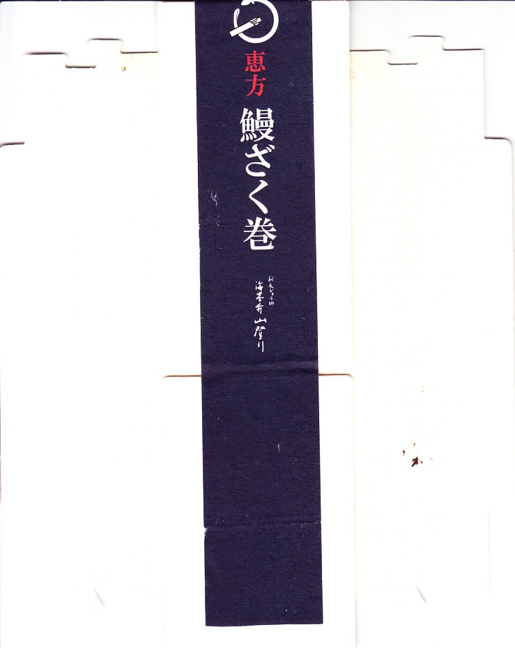 2025(令和7)年2月2日に東京駅で買えた恵方巻で、東京駅では2018年7月から売られるブランド「海苔弁山登り」のもの。木質エコ容器に短い太巻きを1個、ラップに包んで収め、掛紙を長手に巻き、醤油の袋とお手拭きと割りばしを添える。商品名に「鰻ざく巻」とあるとおりウナギのかば焼きと、玉子焼、きゅうり酢漬け、ちくわ磯部揚げ、えび、しいたけ、大葉、桜でんぶを、酢飯と海苔で巻いていた。