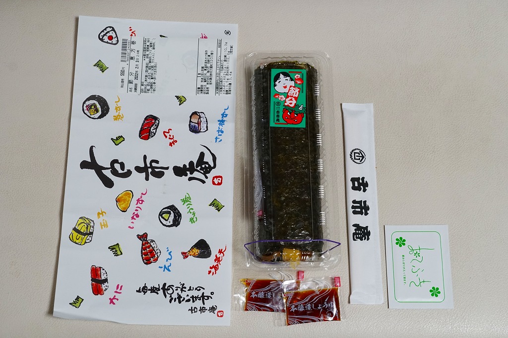 2025(令和7)年2月2日に東京駅で買えた恵方巻。下記の2022年のものと同じく、調製元の名前と持ち帰り寿司の中身の名前やイラストをちりばめた包装紙を巻いた、透明なプラ容器に細身の太巻きを1本。酢飯、玉子焼、しいたけ、かんぴょう、きゅうり、おぼろを海苔で巻いた中身も同じ。今回は醤油の袋をひとつだけ添付した。価格は2割ほどアップ。この年も東京駅では各テナントで節分に恵方巻を販売したが、このような掛紙で長めの太巻きを包む駅弁のような商品は減り、短い太巻きの惣菜が多くなっていた。