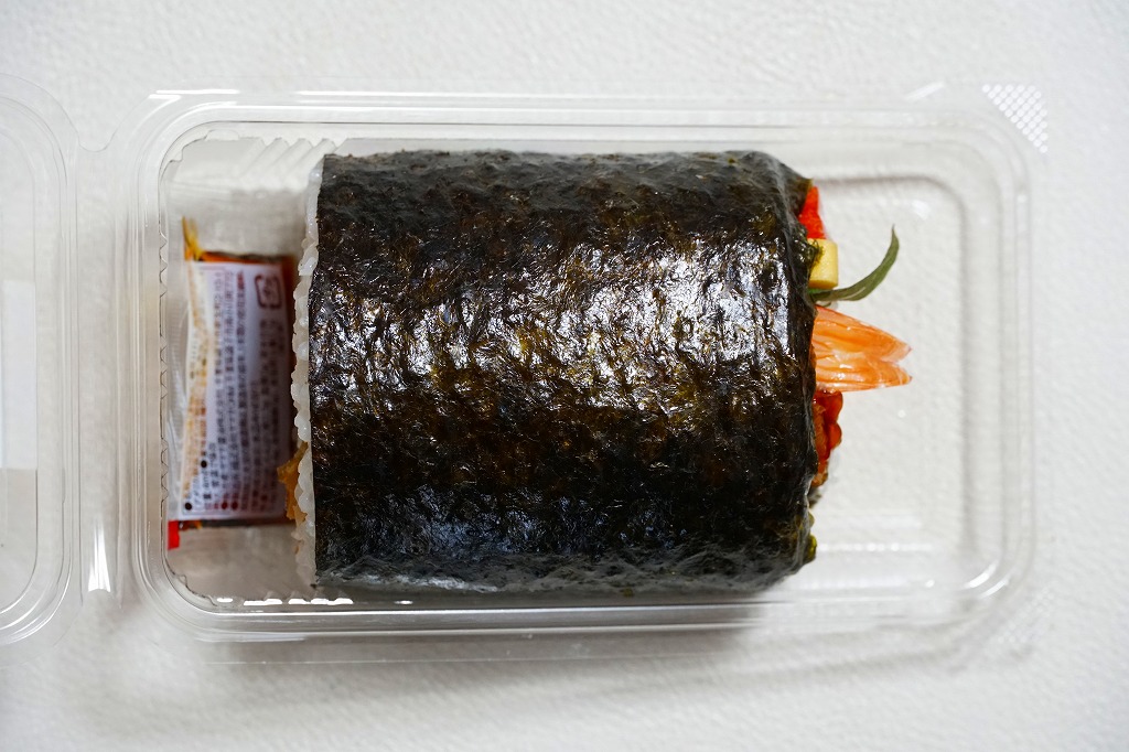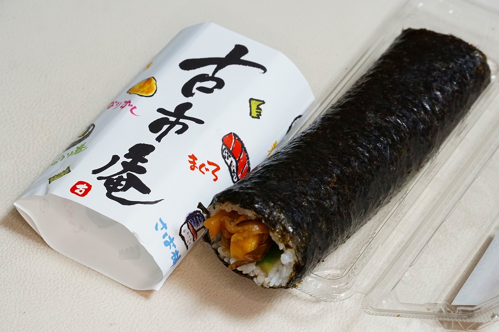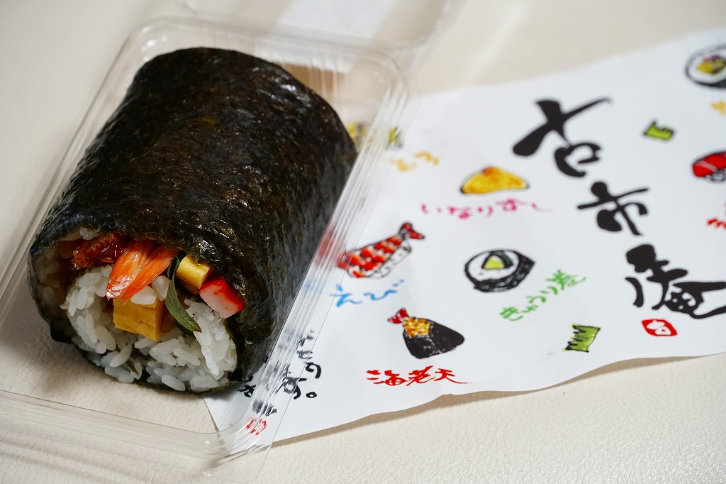 海苔巻き1本を収めた透明なプラ容器に、節分のシールを貼り、ブランドの掛紙を巻く。中身は酢飯、玉子焼、辛子明太子、えび、焼あなご、しいたけ、かんぴょう、きゅうり、カニかまぼこ、大根漬、おぼろを海苔で巻いたもの。太く短く具だくさん。これは恵方と呼ばれる方角を向いて直接かぶりつくとされる恵方巻でなく、惣菜の太巻きという感じ。