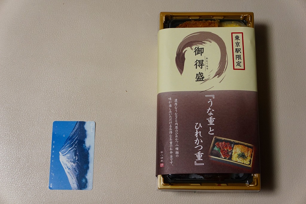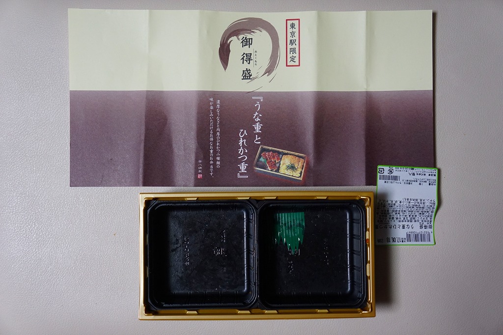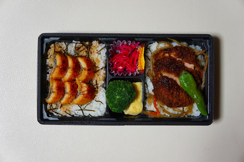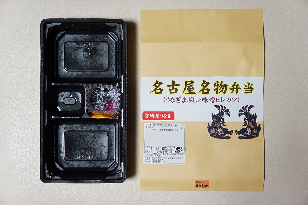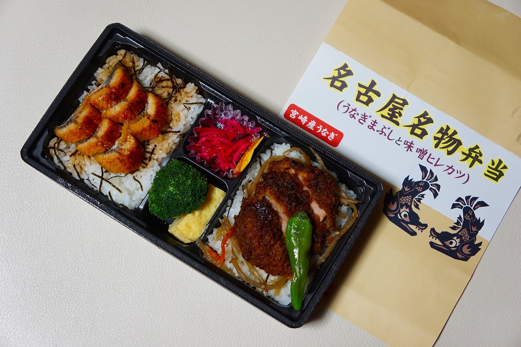 東京駅構内の商業施設「グランスタ」で買えたお弁当。調製元は名古屋、東京、大阪の各地の商業施設に店舗を展開する惣菜屋ないし食品業者であるため、この弁当も東京駅に限らず各地で売られるものと思われる。中身は白御飯が多め、具が少なめの、鰻丼とカツ丼の組合せ。これを名古屋っぽく表現して、「うなぎまぶしと味噌ヒレカツ」となる。見た目どおりの味がする、デパ地下の惣菜弁当。駅弁屋と違い、ここでは各テナントが店内で弁当を調製している。2016〜2017年の販売か。