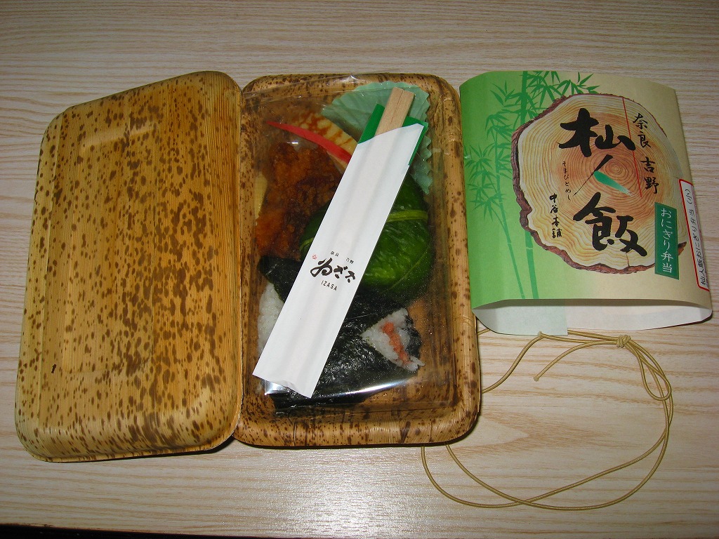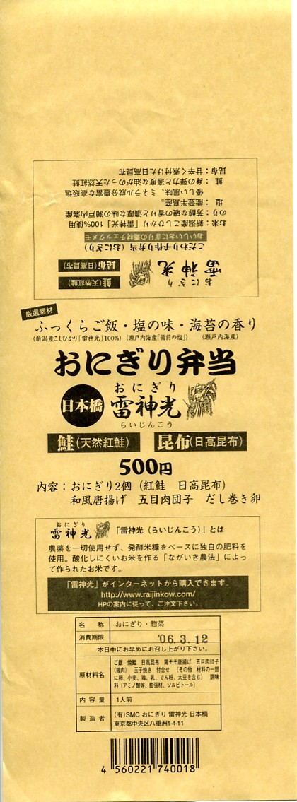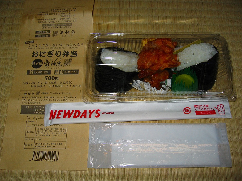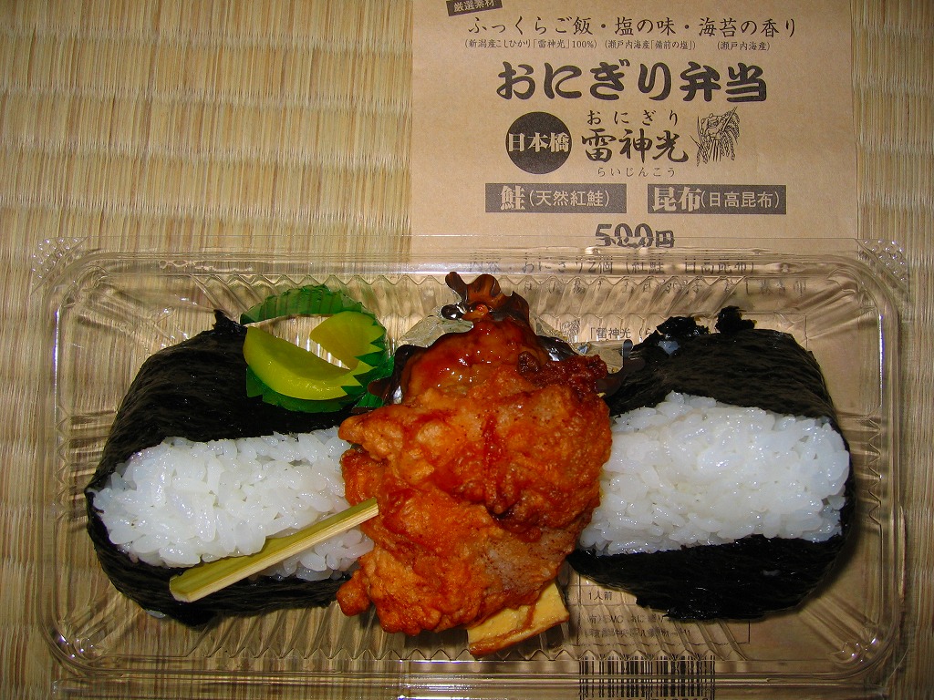 東京駅構内のJR系コンビニで買った商品。透明なプラ製容器の中に、鮭おにぎりと昆布おにぎりが1個ずつと鶏唐揚、玉子焼、肉団子が入るコンビニ弁当だが、NREの駅弁売店で売っている太巻きと同じような体裁を備え、しかもブランドネームまで入れているので、駅弁と見なされたり紹介される可能性を感じる。味はコンビニの水準を超えている。このブランドの商品や店舗が消えた2007年頃までの販売か。