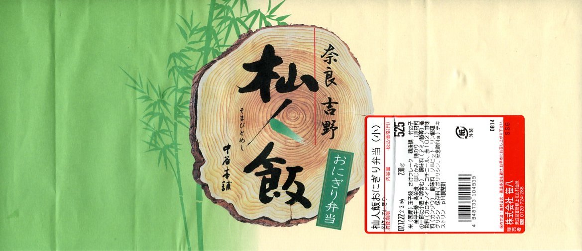 つまり、商品名どおりのおにぎり弁当。分量や価格はそんなものだろうが、この内容なのに御飯がうまくないという致命的な欠点がある気がした。調製元もスーパーの駅弁大会での属地不詳調製所不明さが気になっているところ。駅では「杣人飯」の名で様々な内容と価格の弁当をあちこちで出していた模様。それらの商品群は2016(平成28)年頃までの販売か。