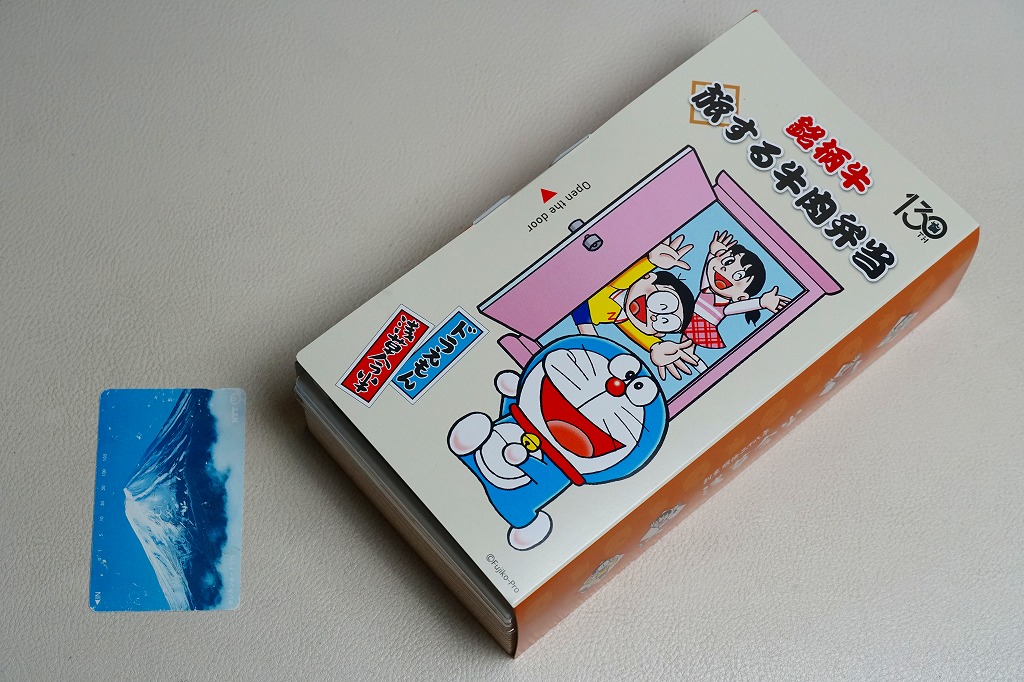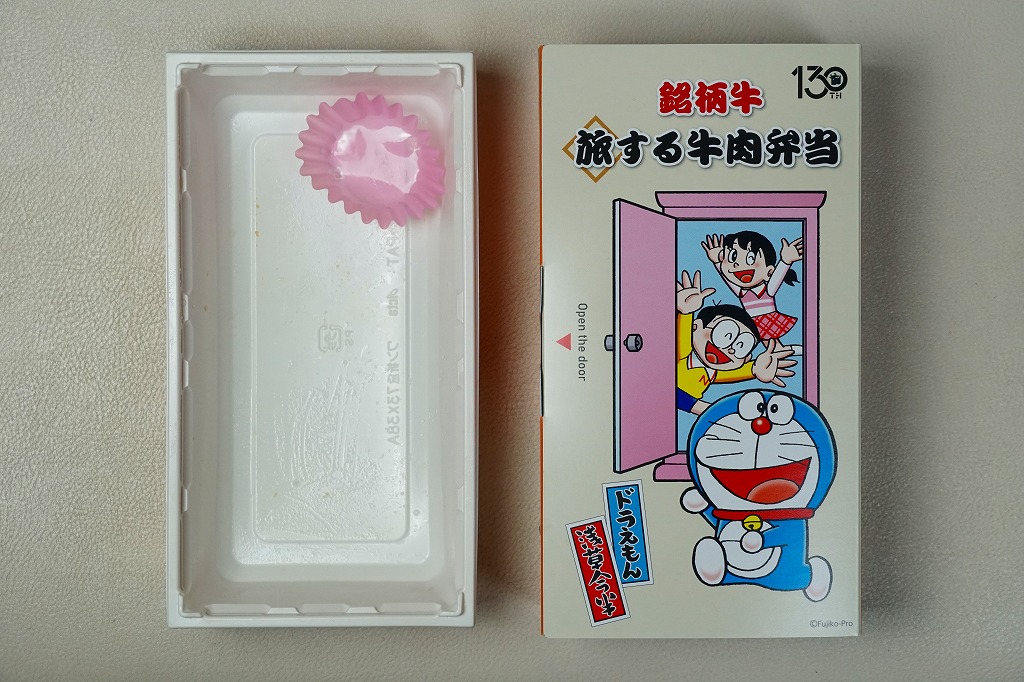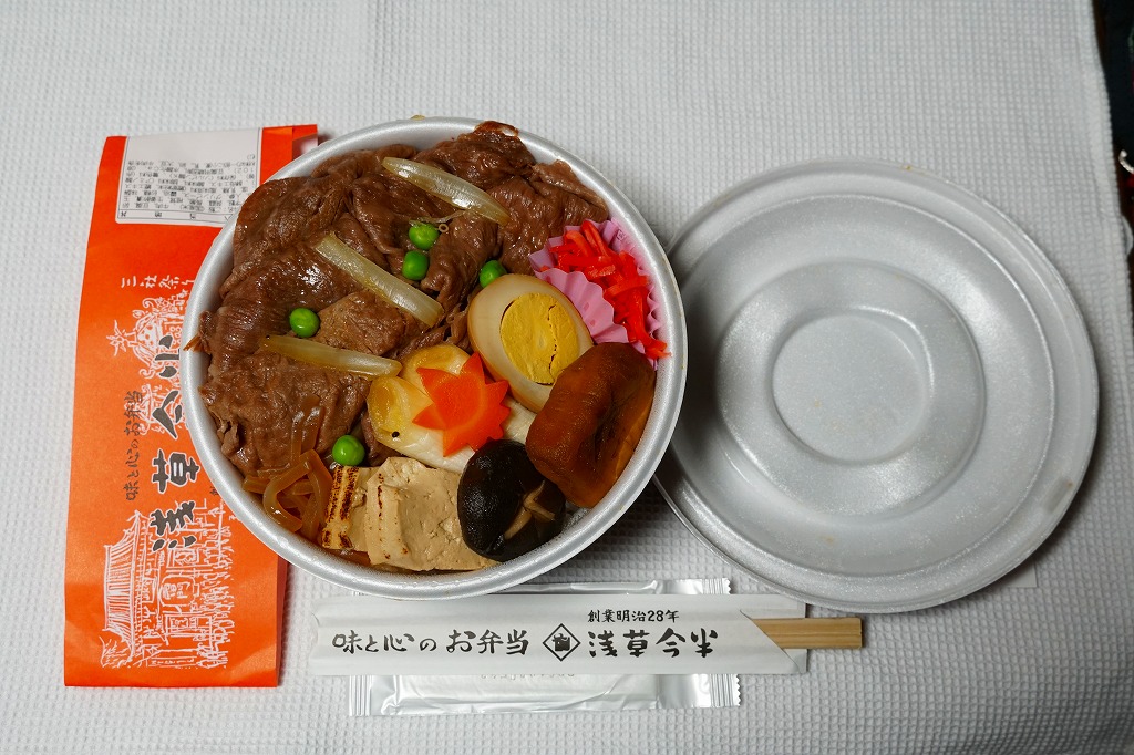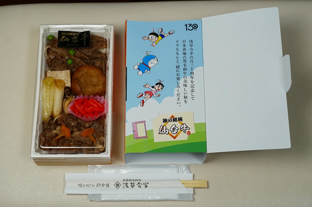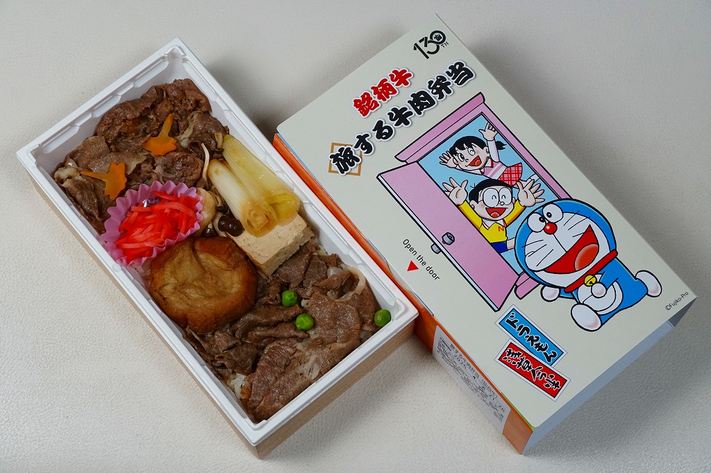 浅草今半創業130周年を記念し、2025(令和7)年4月1日から期間・数量限定で、同社の日本全国の弁当売場で販売。東京駅でも買えて、「旅する」という文字もあり、まるでドラえもんのキャラクター駅弁にも見える。藤子・F・不二雄の連載漫画「ドラえもん」で半世紀以上深く親しまれ、誰もが見てわかると思うキャラクターを、スリーブに描き、扉を開けてもまた描かれる。中身は白御飯を銘柄牛の牛肉煮と長ねぎ、焼豆腐、油麩、紅生姜で覆い、にんじんとグリーンピースで彩るもの。風味はいつもの浅草今半ブランドで、薄手で柔らかい牛肉の赤身やざらつきがとてもおいしい、醤油味の高級な牛すき焼き弁当。