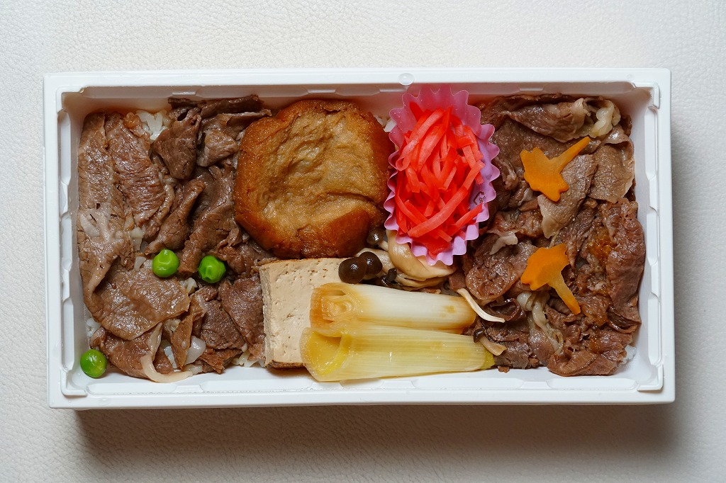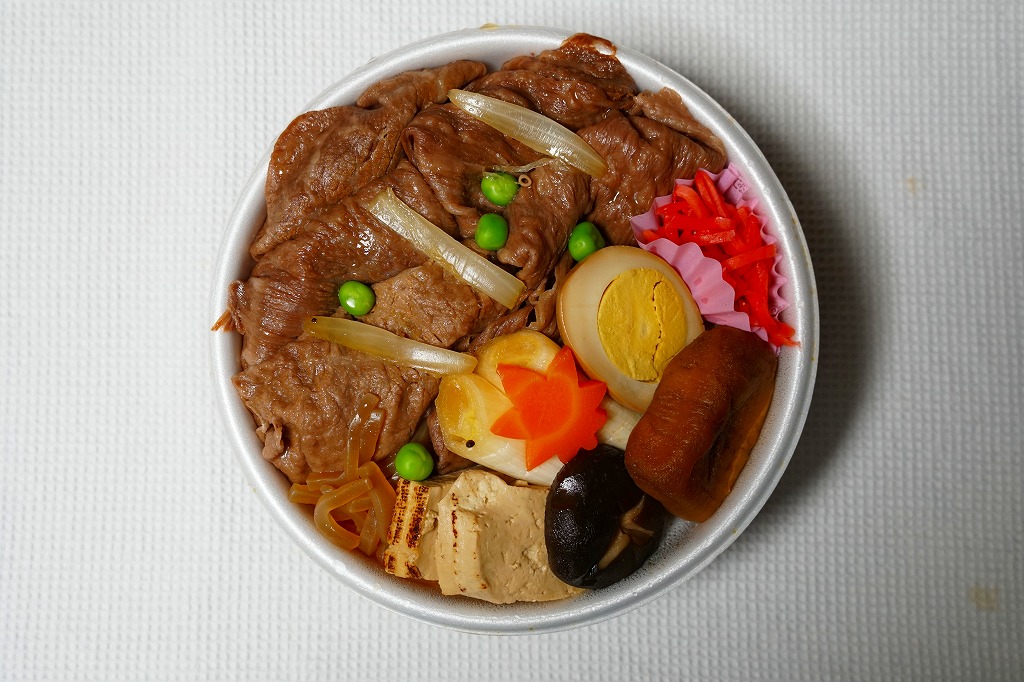 JR東日本の100%子会社である鉄道会館が2018(平成30)年10月1日から11月18日まで東京駅構内で実施した、「第3回東京駅丼グランプリ」へのエントリー作のひとつ。エキナカの76店が丼ものの弁当やメニューで勝負し、これは一日20個を提供して第6位になったという。東京都心を中心に日本全国のデパートや商業施設に店舗を展開する牛肉弁当屋の商品。