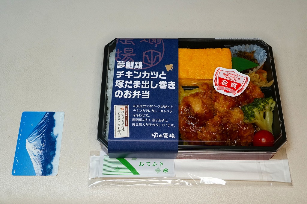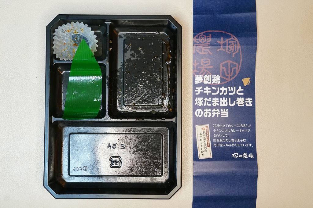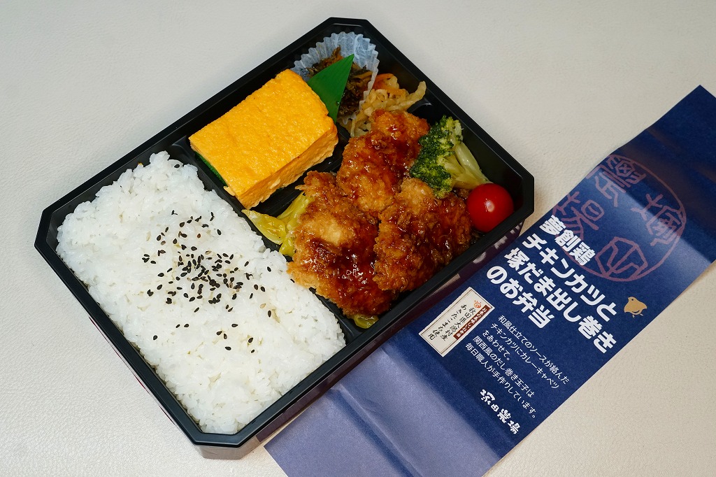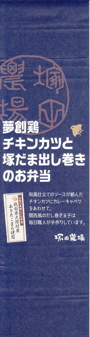 2018(平成30)年までに発売か。白御飯とチキンカツとカレーキャベツと玉子焼と、その他付合せのお惣菜。お米には秋田県大潟村産あきたこまちを、チキンカツには宮崎県産銘柄鶏夢創鶏(むそうどり)のムネ肉を、玉子焼には自社ブランド卵「塚だま」を使用するのだという。駅弁として認識されることのない、デパ地下弁当や仕出し弁当だと思うが、これがファベックス展の「惣菜・べんとうグランプリ2019」の駅弁・空弁部門で金賞となった、つまり駅弁や空弁として考えられているようなので、購入してここに収蔵した。