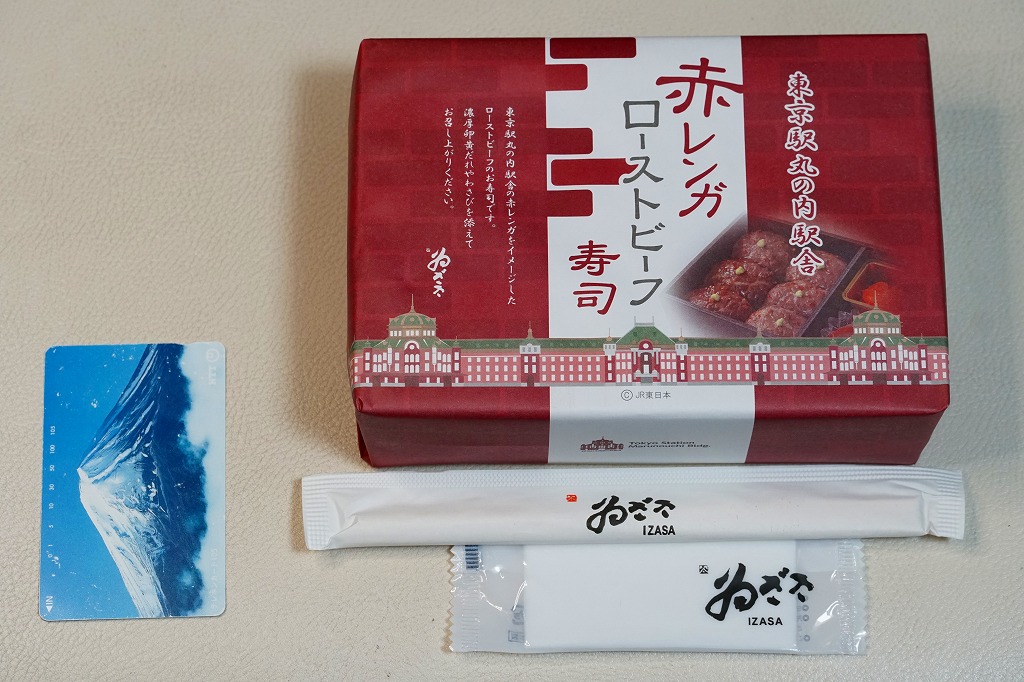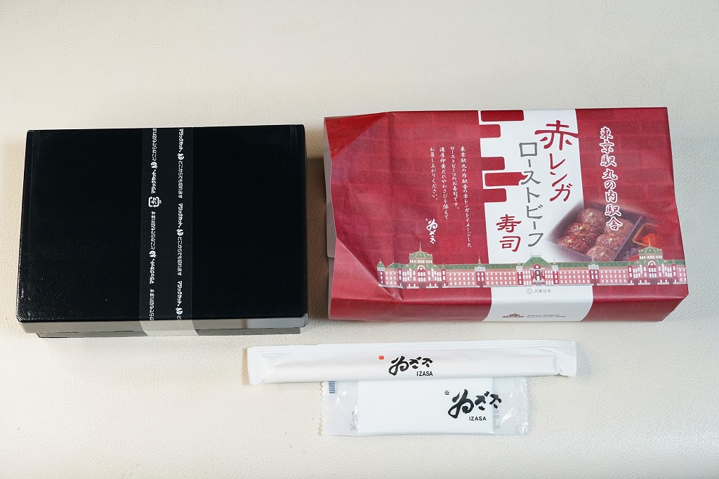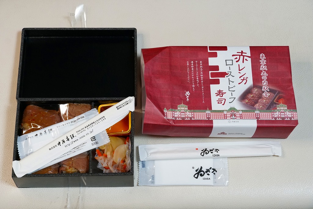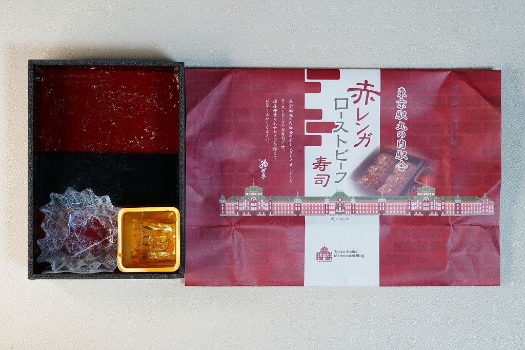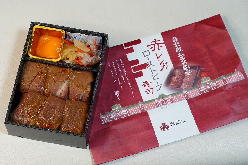 2022(令和4)年の9月までに、東京駅で発売か。東京駅の商業施設「グランスタ」地下1階の食品売り場のテナントのうちいくつかで、ここ限定の弁当を販売していることを、この頃までに壁広告として現地に掲示した。これは奈良吉野を名乗り関東と関西の都心で様々な店名にて手広く柿の葉寿司などを販売する業者の商品。包装紙は東京駅丸の内駅舎や煉瓦積みのイラストに、中身の写真でデザインされた。中身はローストビーフ寿司が6個と、卵黄、大根なます、甘酢生姜、わさび袋。メインの寿司は焼肉のたれを肉に漬けて飯に浸透し、ローストビーフというよりはむしろ牛焼肉の味がした。