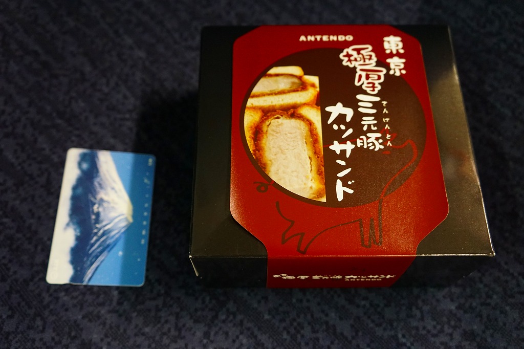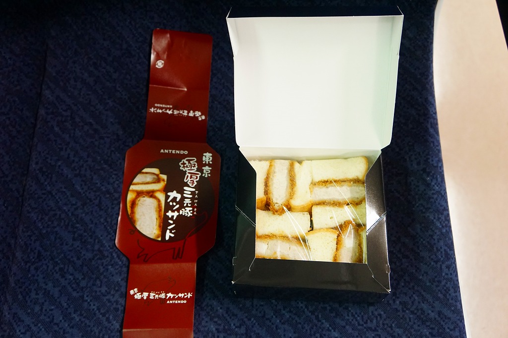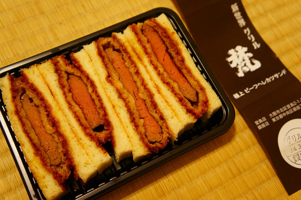 東北新幹線新青森開業に合わせて、2010(平成22)年12月4日に開業した東京駅構内食品街「グランスタダイニング」内の駅弁売店「ニッポンの駅弁」で駅構内デビュー。プラ製のサンドイッチ向け惣菜容器に、ブランドネームや商品名を印刷したソース色の紙を巻く。中身は牛肉のヒレカツサンドが4切れ。この分量で1,000円も取るのだから駅売りサンドとしては超高級品。牛肉サンドにありがちな肉の少なさや固さや香りの少なさとは無縁な、味にも歯応えにも弾力感と柔らかさを備える傑作。