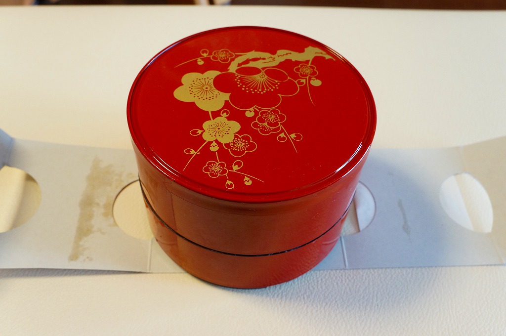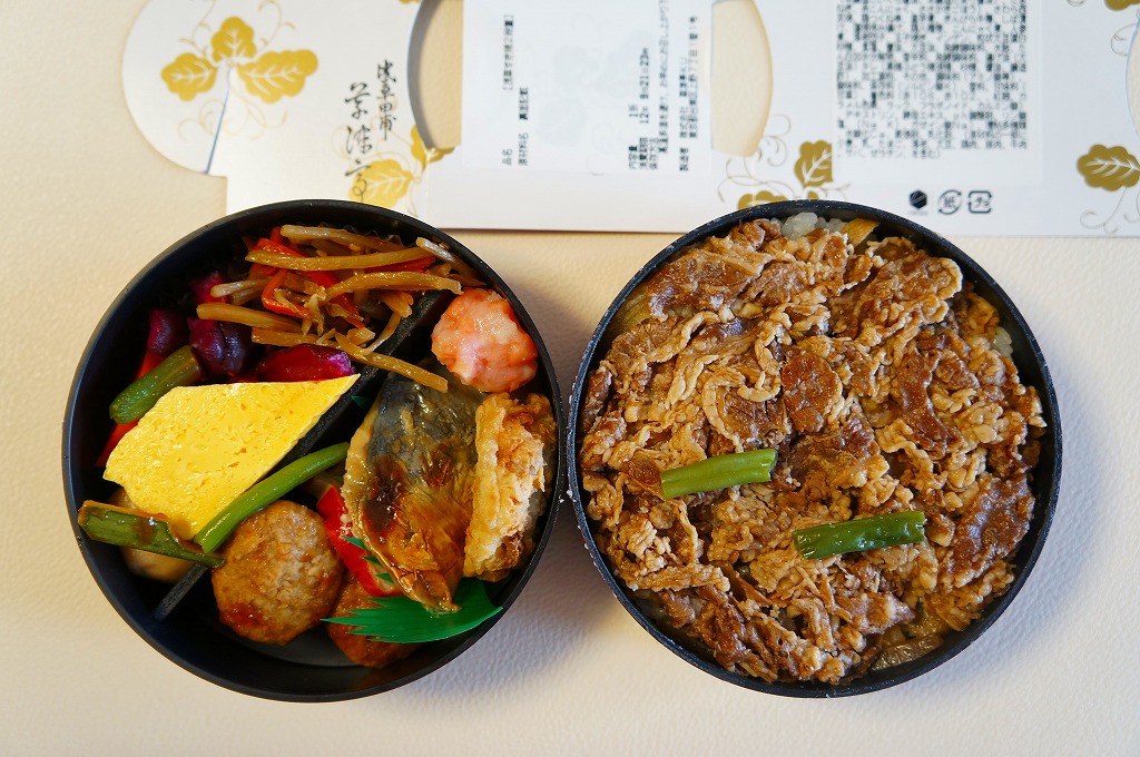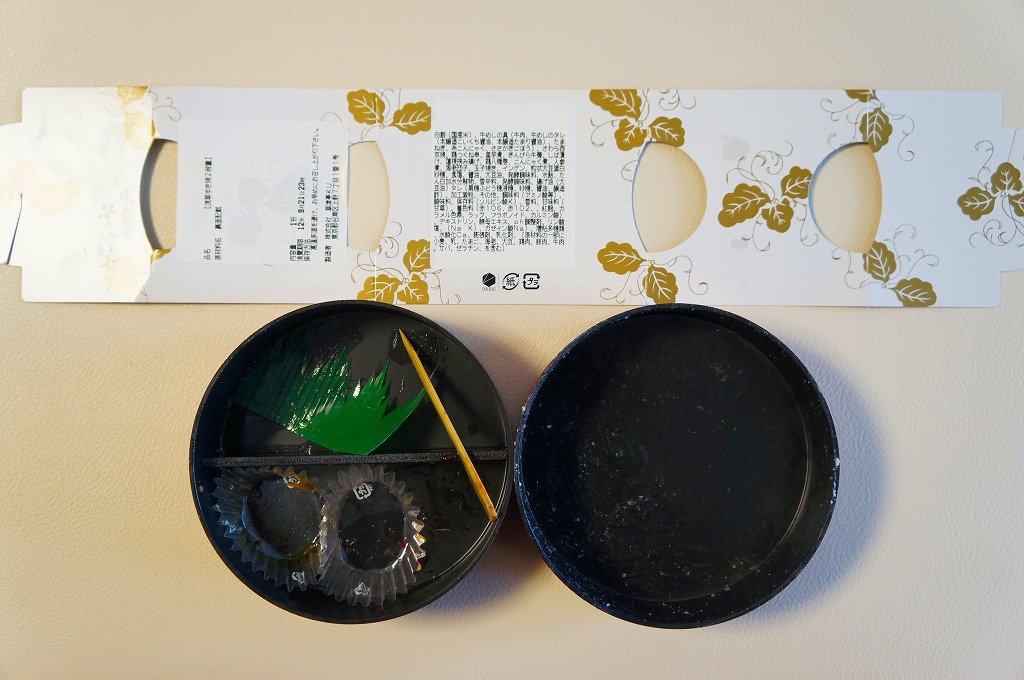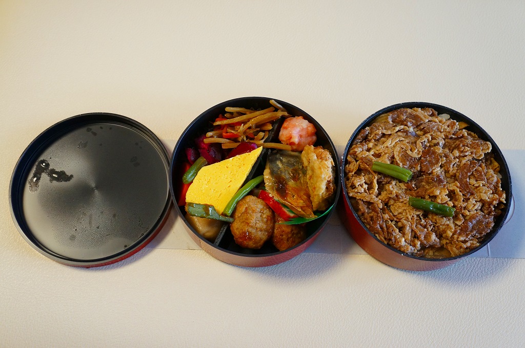 黒地に朱塗りの丸いプラ製容器の中身は、下段が牛丼、上段がおかずで玉子焼、サワラ西京焼、鶏つくね串、レンコン挟み揚げ、ささがきごぼう、ニンジンやサトイモなどの煮物、しば漬けなど。見た目のとおり、駅弁以上にしっかりしっかり濃い味付け。