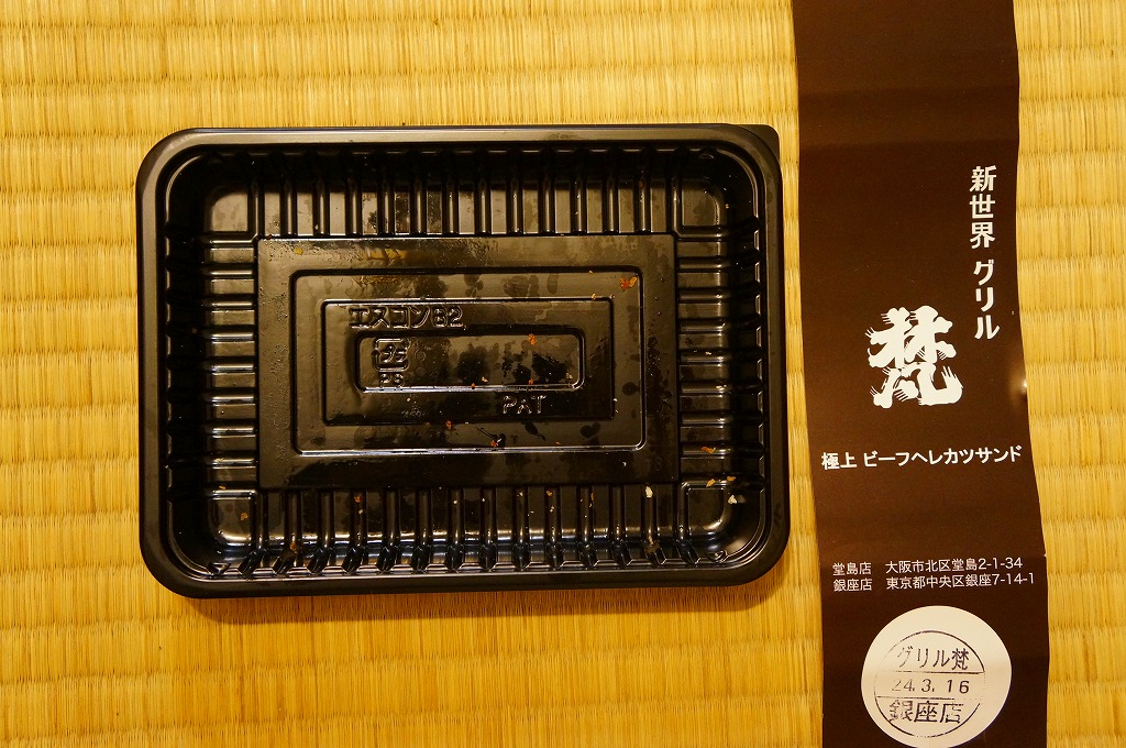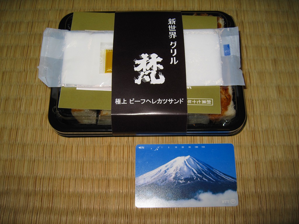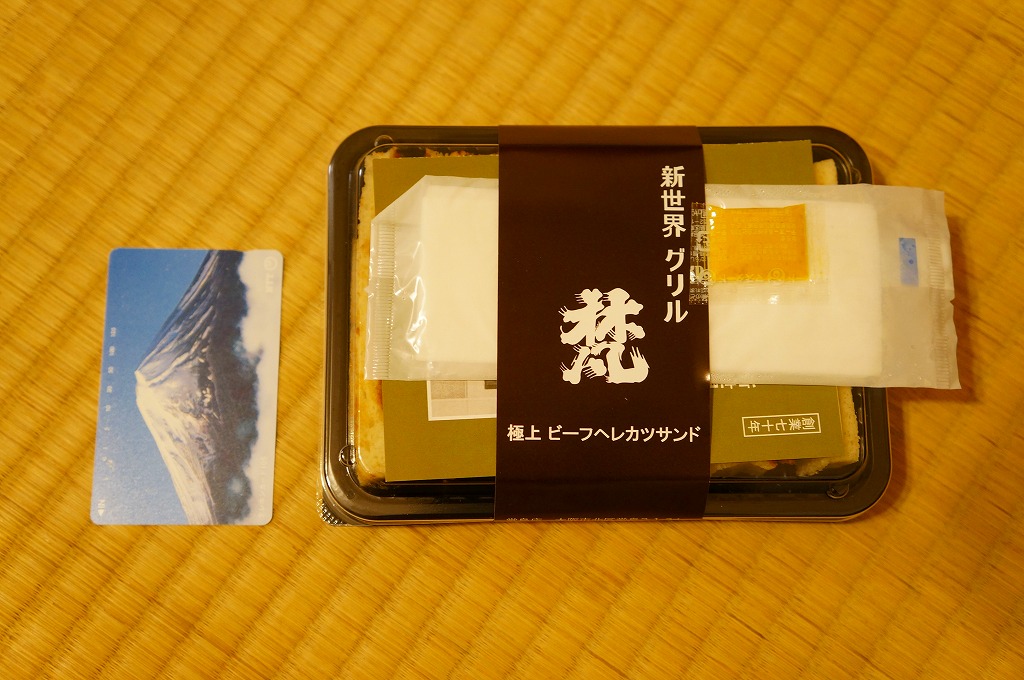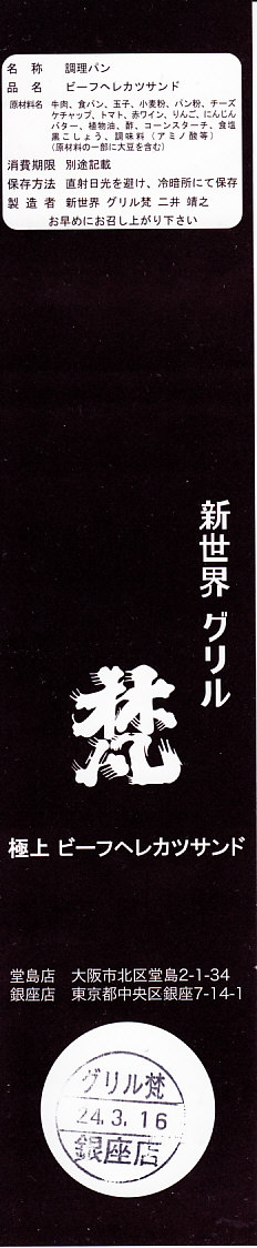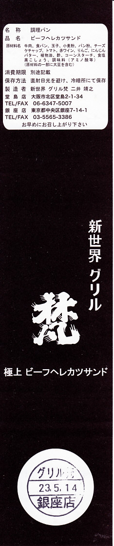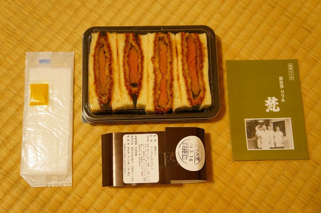 「新世界」や「ヘレカツ」の単語から感じられるように、調製元は大阪ミナミの歓楽街で1937(昭和12)年に創業した洋食屋。2008年に東京銀座にも進出し、両店でこのサンドイッチも販売や配送を実施しているそうな。これは「ハーフ」のようで、「一人前」だと2,000円にもなる。レストランで注文すると1,890円。