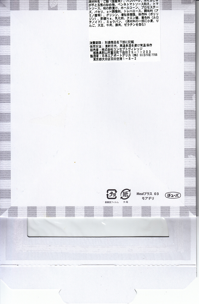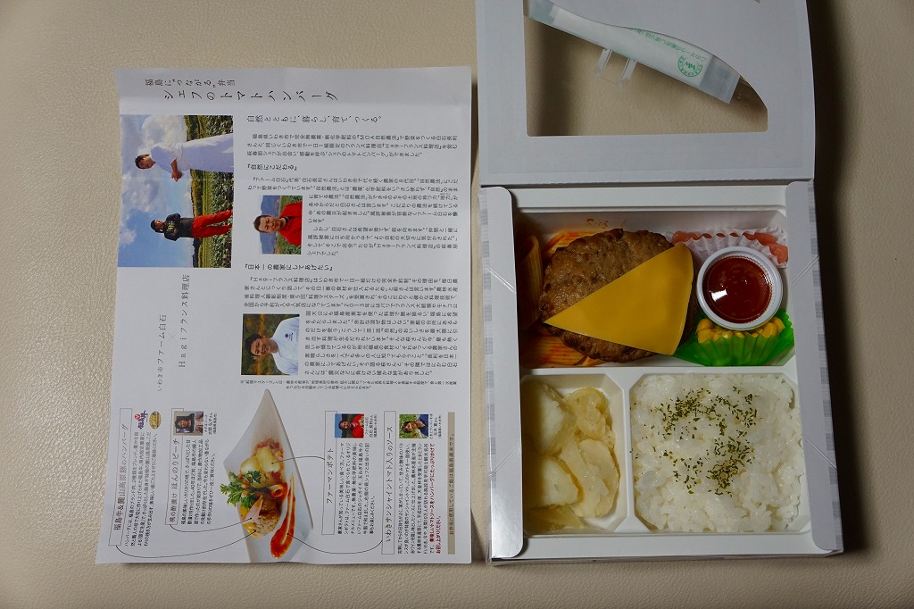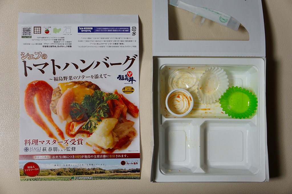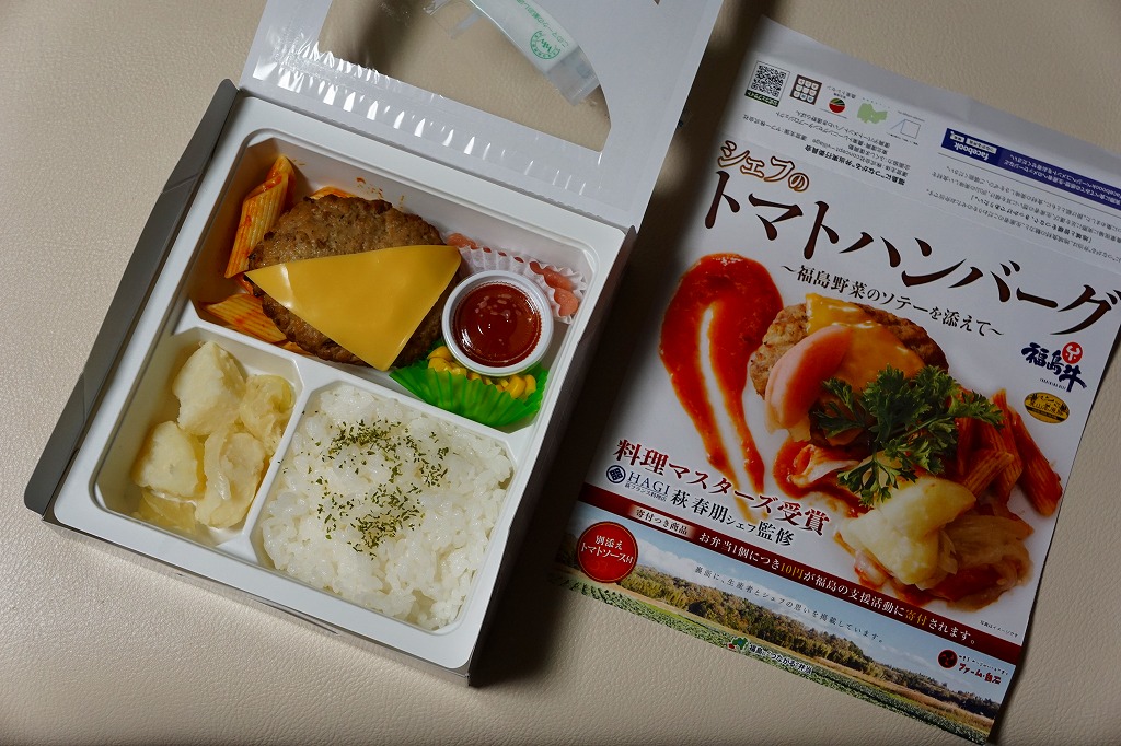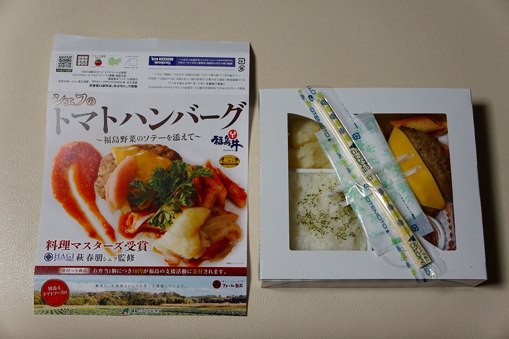 中身のイメージ写真が美しい掛紙では、その表と裏で福島県いわき市内のフランス料理店の監修をアピール。窓から中が見える紙箱の中身は、ライス、ポテト、福島牛と麓山高原豚のハンバーグ、ペンネ、トマトソース、コーン、桃の酢漬け。掛紙と容器と中身の白さが、肉の駅弁屋ハンバーグの駅弁らしからぬ爽やかさを演出し、見た目も味もおしゃれなもの。ただ、密度が高くて固く締まったハンバーグを、添付の割りばしを折らずに食べるのには工夫が要ると思った。