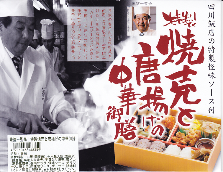 「陳建一監修」とのことで、パッケージにはその名前と写真が載り、中身の写真と商品名が描かれる。添付のしおりでもイラスト付きで描かれる中身は、十六穀米と白御飯の俵飯3個ずつに、焼売2種、鶏唐揚、ナス味噌炒め、イカチリ、春雨、高野豆腐など。四川料理を名乗るものの、ミニカップ入りの超激辛な「怪味ソース」を使わなければ、辛いものはないという親切な設計だった。2017年までの販売か。