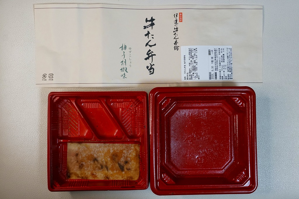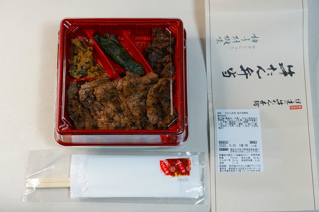 宮城県内と東京都心でチェーン展開する牛たんレストラン・牛たん商品店の商品であり、東京駅の駅弁とは考えにくいが、牛たん焼に柚子胡椒の味付けをしたこの弁当は、東京駅限定で販売する商品のようで、現地ではそのように電飾広告で宣伝され、人気の東京駅弁と紹介する記事もある。いずれの地でも人気の牛タン専門店の弁当であり、肉の厚みと風味は東京駅弁や仙台駅弁の牛たん弁当を上回るとも思う。