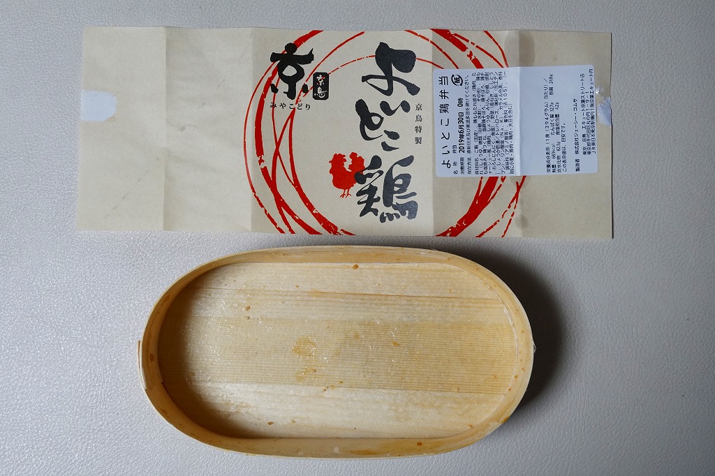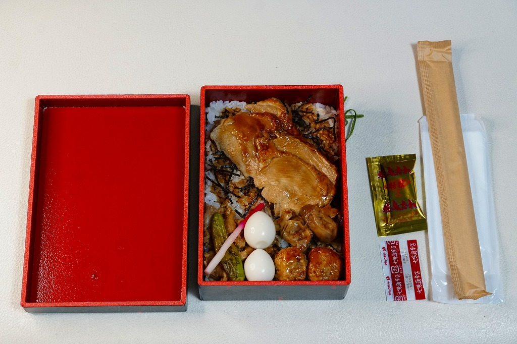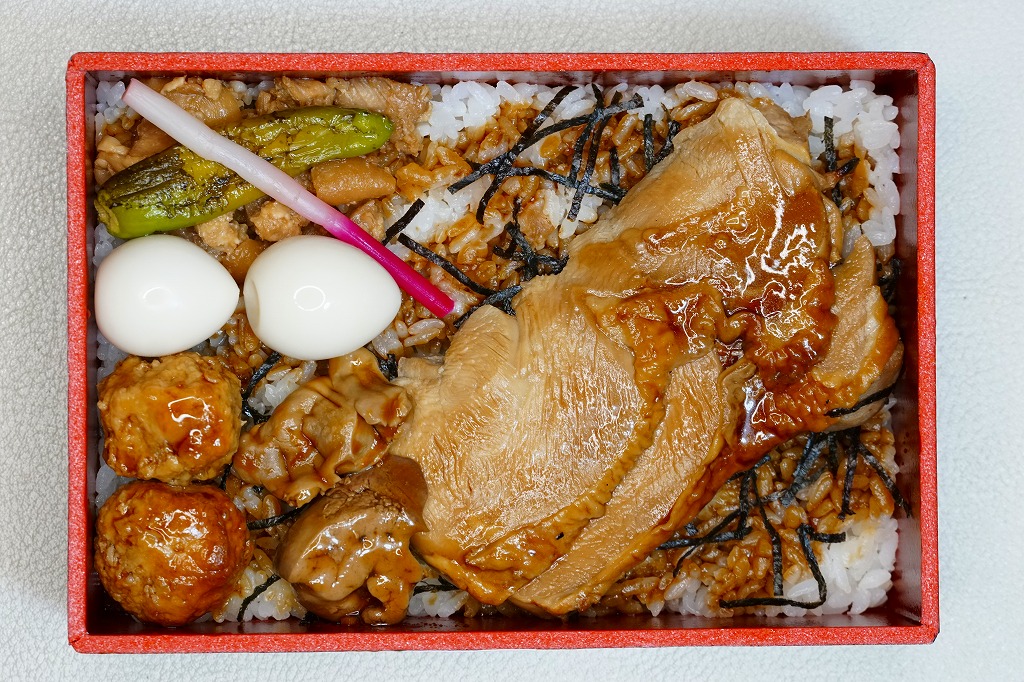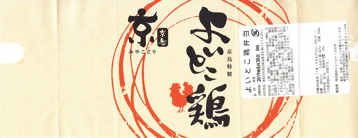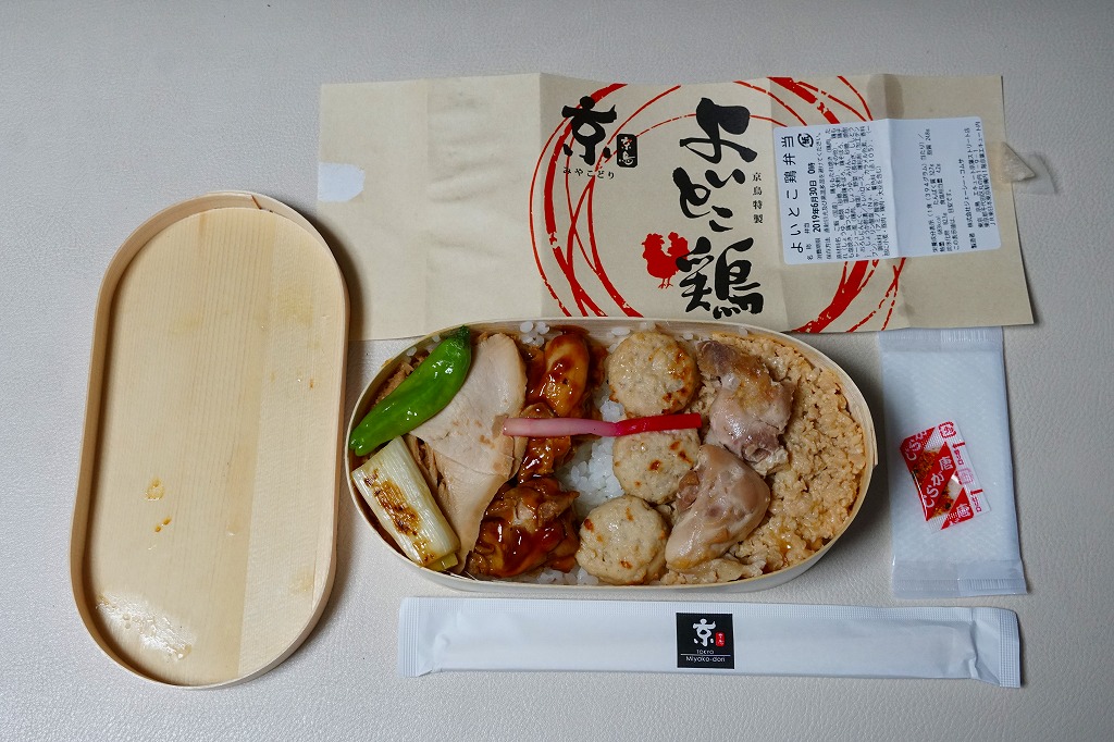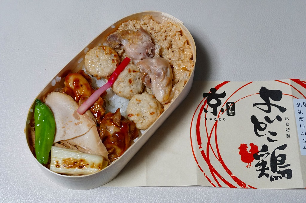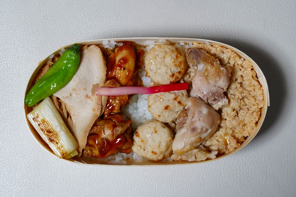 2019(令和元)年のゴールデンウィークまでに発売か。2017年10月や2018年5月に1,280円で販売した記録もある。東京駅構内の商業施設「京葉ストリート」に、2013(平成28)年4月に進出したテナント「京鳥(みやこどり)」で、東京駅限定とうたい販売していたお弁当。小判型の容器に白飯を詰め、鶏たれ焼3個、鶏つくね3個、鶏しお焼2個、鶏そぼろ、ハムのような鶏チャーシューと様々な鶏を載せ、ネギ、ししとう、はじかみを添える。塩気が強くも鶏肉の香りを感じられる風味は、駅弁とは異なる美しさを感じた。調製元はピザと鶏で創業半世紀の外食産業会社。購入後ほどなく売り止めたか。