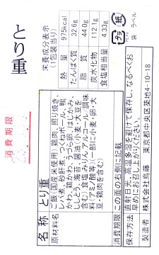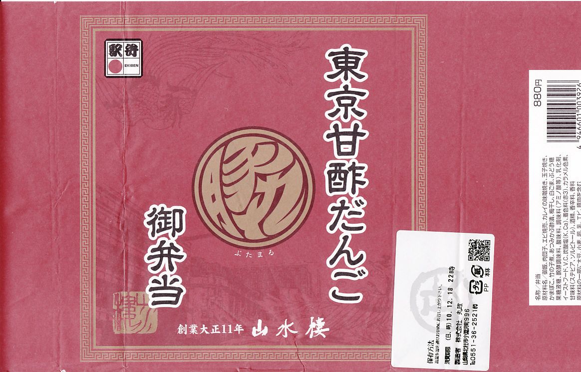 2012(平成24)年3月16日の調製である東京駅弁の掛紙。上記の2011年のものと比べて、調製元店舗の表記位置が食品表示ラベルから掛紙本体へ移動している。