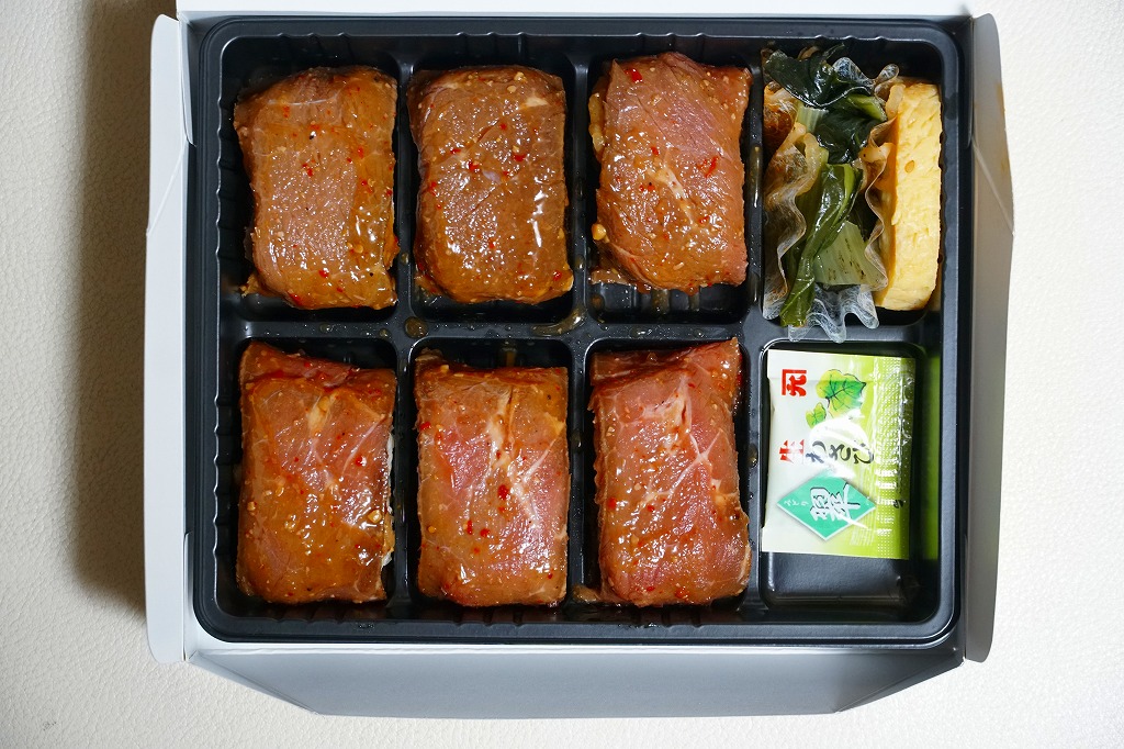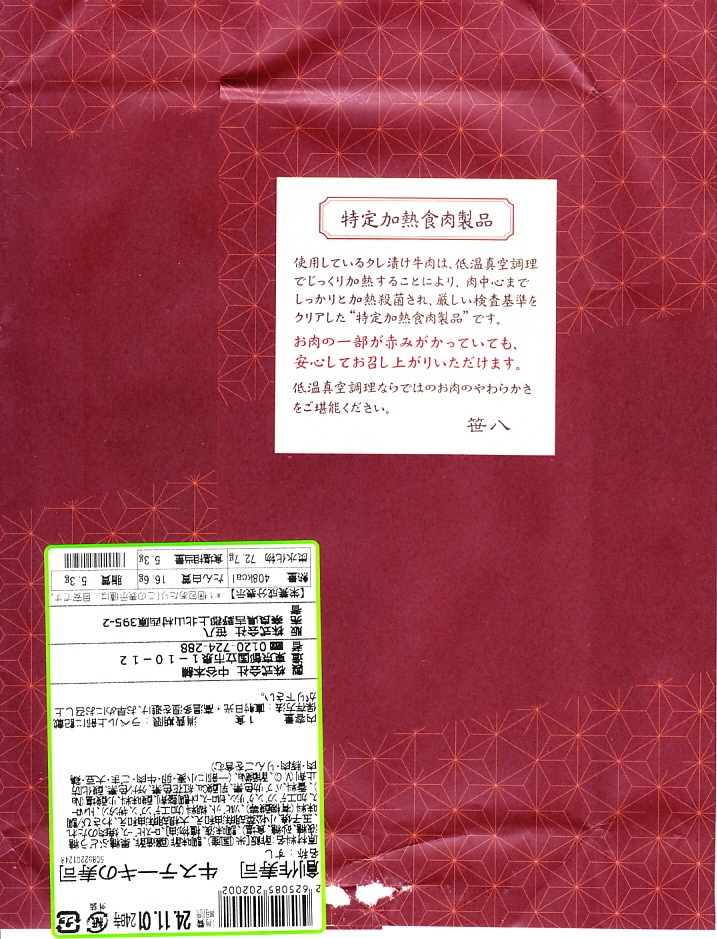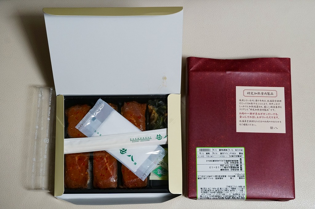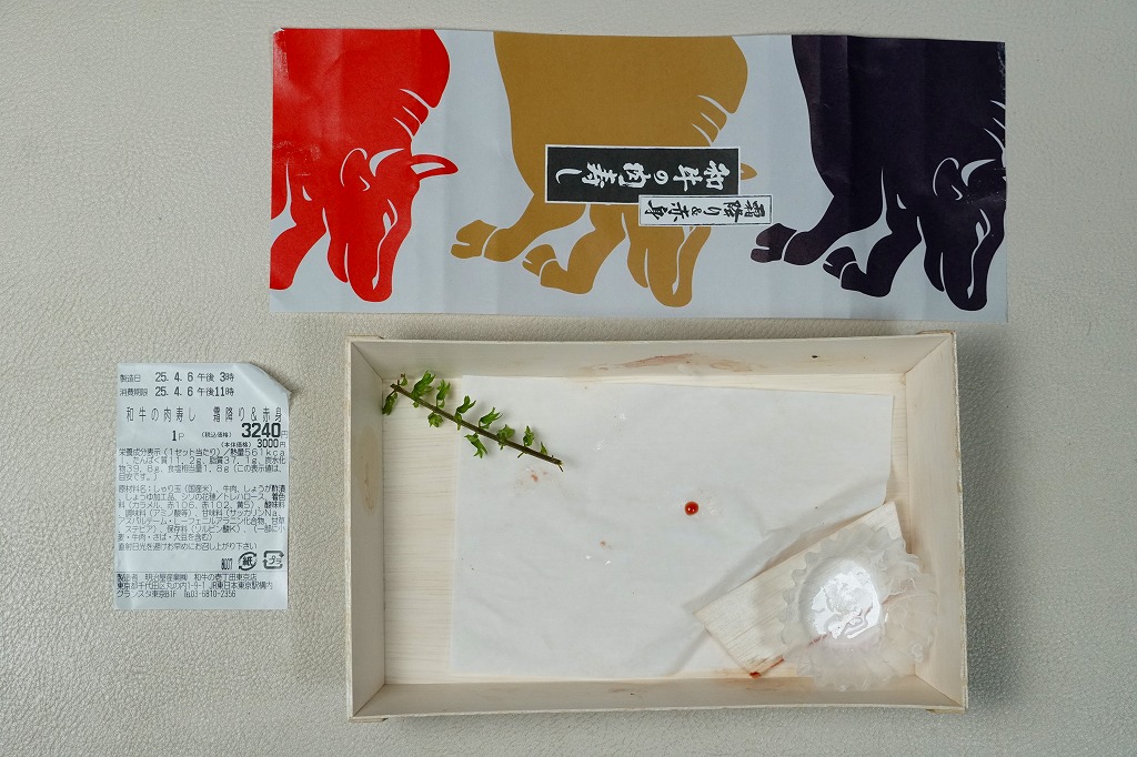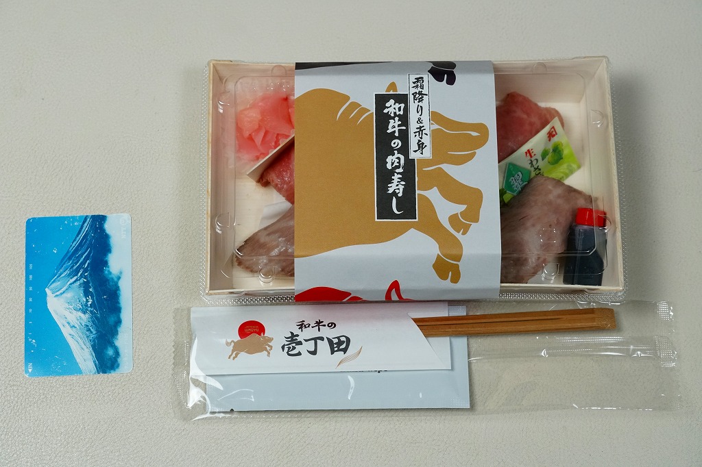 東京駅構内の商業施設「グランスタ」の、地下1階の食品売り場「スクエアゼロエリア」内のお弁当・惣菜ゾーンのリニューアルに合わせて、2024(令和6)年4月24日に発売。店舗に「東京駅限定」の掲示があったものの、東京を中心に全国でチェーン展開するテナント「肉処壱丁田」「博多肉の壱丁田」「和牛の壱丁田」で買える模様。霜降りまたは赤身ランプの肉寿司を6個、木質エコ容器に並べて、商品名の掛紙を巻く。これは「霜降り&赤身」で、それぞれ3個ずつ入っていた。見るからに高価な、薄く上品でほぼ味のない牛肉の巻き物。
