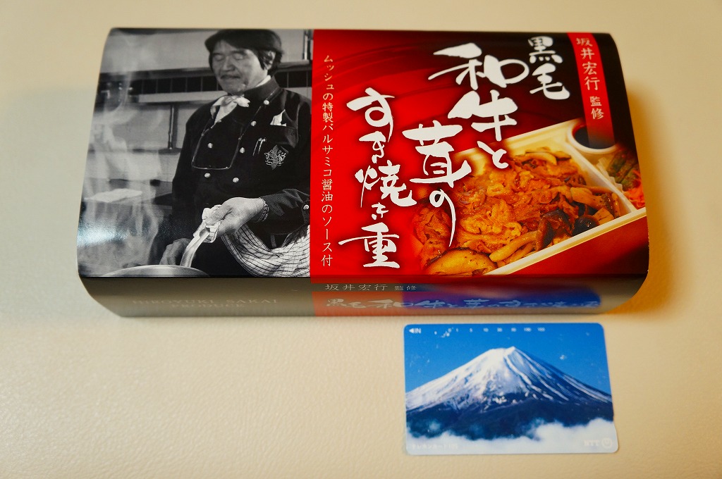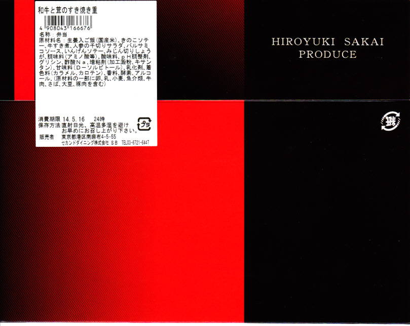 2014(平成26)年の発売か。「坂井宏行監修」を名乗るお弁当。ショウガ入りの御飯を、シメジやシイタケのソテーと牛肉煮で覆い、ニンジンとインゲンとバルサミコソースを添える。高級フランス料理店のキノコ牛丼なのか、薄くふんわりとしたすき焼き肉は、上質で柔らかくも味がない。特製バルサミコ醤油ソースをかけると、今度は激辛になってしまい、シンプルな内容なのに食べ方が難しい弁当だった。2015年までの販売か。