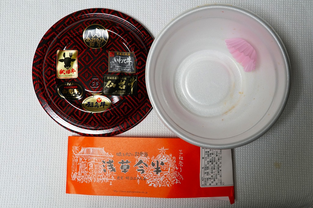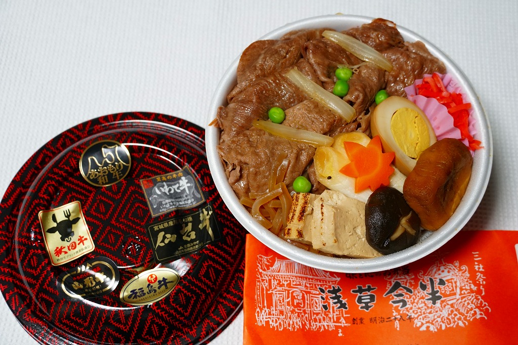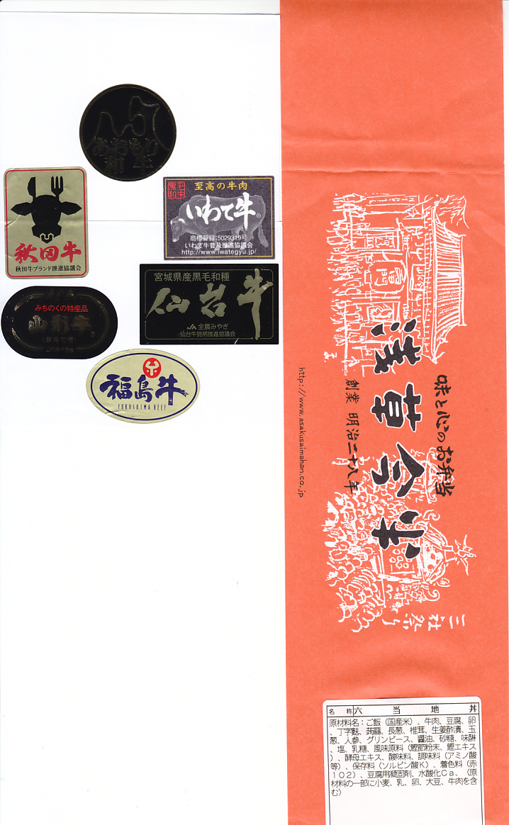 大きな丼に同店共通の掛紙を巻き、容器に6種類ものブランド牛のシールを貼り並べるのは壮観。中身はつまり牛丼で、白飯をすき焼きの具で覆う。東北六県の牛肉は今半クオリティな薄手の牛肉煮を飯の底と上にたっぷり6枚。これが「あおもり和牛」「いわて牛」「仙台牛」「秋田牛」「山形牛」「福島牛」なのだろう。煮玉子や煮豆腐やネギなどの具と紅生姜を加え、2人前以上ありそうな全体の分量を含め、これは食べ応えがありすぎる高級牛丼。しかしキャンペーン期間をもって売り止めた模様。