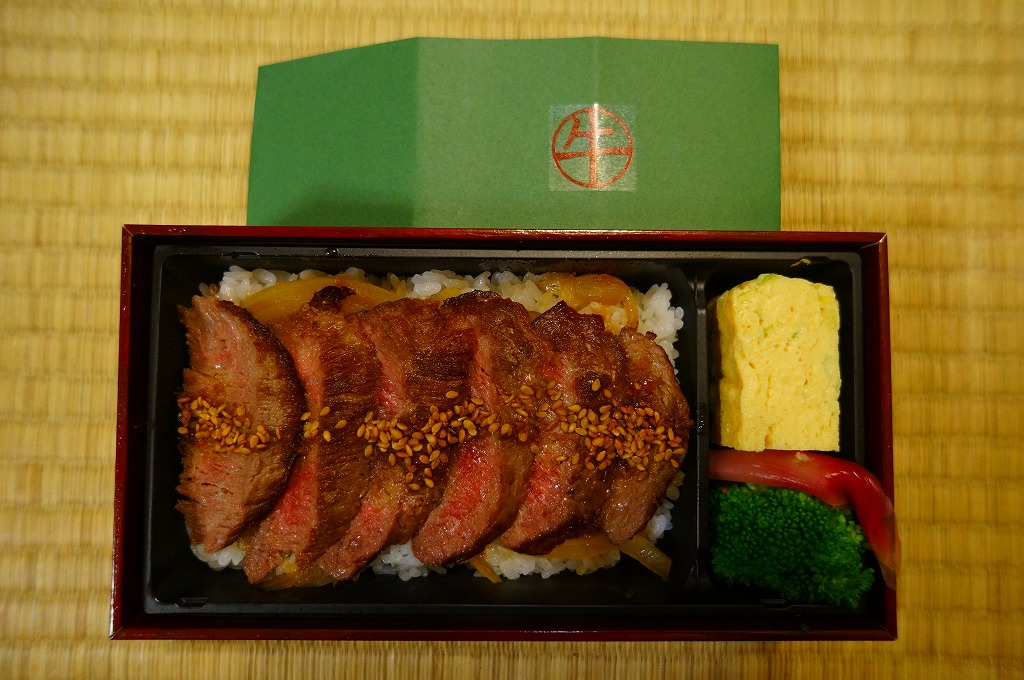 東京駅八重洲南口付近改札内の売店群「京葉ストリート」の牛肉店で注文販売されていたお弁当。注文から入手まで20分くらいかかった。木のように厚く固いボール紙製の長方形の容器に、「牛」のシールを貼った緑色の紙を巻く。中身は白御飯の上にタマネギ炒めを載せ、山形牛のステーキで覆い、ブロッコリー、みょうが、玉子焼を添えるもの。