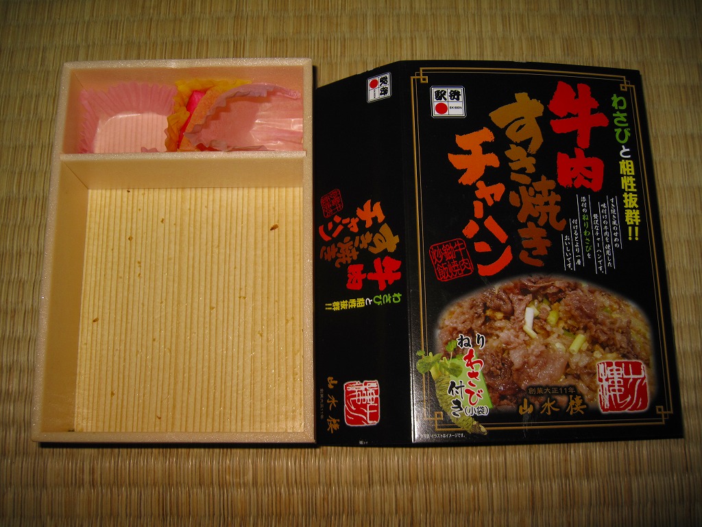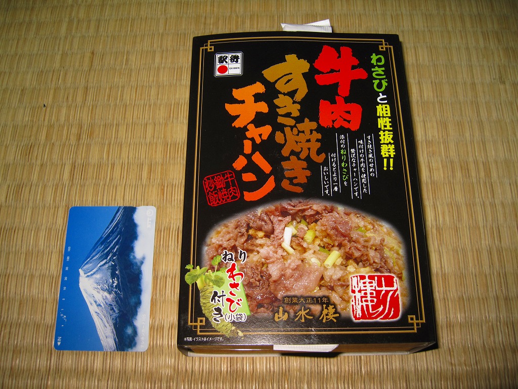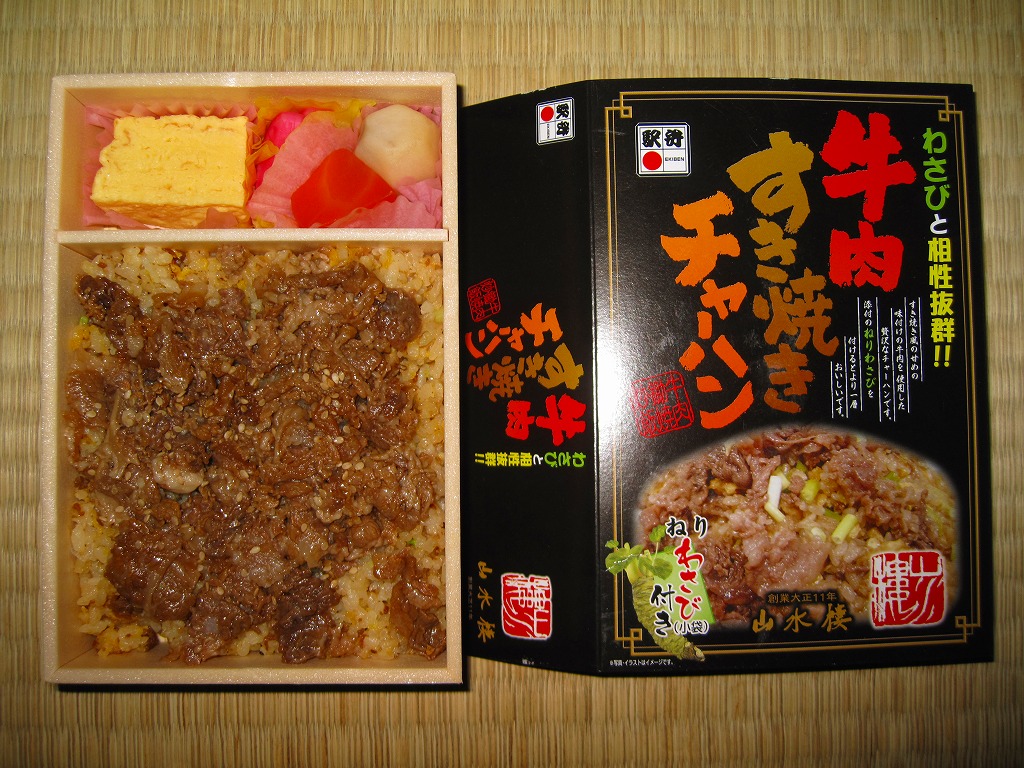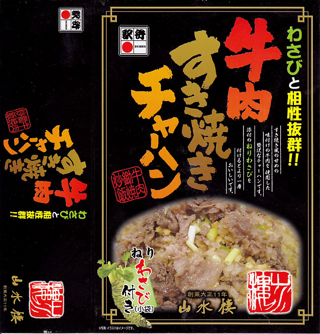 やや小柄な長方形の発泡材製容器に透明なふたをして、中身のイメージ写真や商品名や宣伝文を書いた黒いボール紙の枠にはめる。中身はチャーハンの上に牛すき焼き肉を詰めて、玉子焼、ニンジンとサトイモの煮物、赤かぶ漬を添えるもので、内容も風味も駅弁の名前どおり。ねりわさびが2袋も入り、これを使用することが推奨され、その個性的な仕掛けと味が特徴であるようだが、個人的にワサビは無理なので使わなかった。2014年までの販売か。