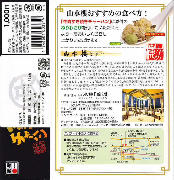東北新幹線新青森開業に合わせた、2010(平成22)年12月4日の東京駅構内食品街「グランスタダイニング」内「ニッポンの駅弁」の開業に伴い、同日にオープニングスタッフとして発売か。東京都日比谷の中華料理屋のブランドを名乗り、パッケージ底面の記述によるとこの店舗が山梨県の小淵沢にもオープンしたそうで、そして調製元は小淵沢駅の駅弁屋で、これでパッケージに駅弁マークが付き、しかし販売箇所は東京駅となる。