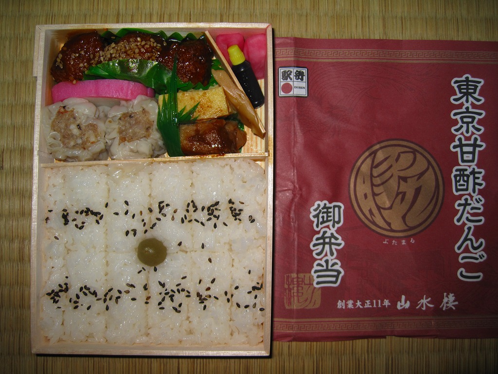 木製の長方形の容器に、商品名と何らかのマークを印刷する紫色の掛紙を巻く。中身は俵飯風に至らぬ日の丸御飯に、肉団子が3個、エビ焼売が2個、カレイ味噌焼、玉子焼、かまぼこ、タケノコ煮、赤かぶ漬。横浜駅弁「シウマイ弁当」と名前や内容はかなり違うが、同じような機能と雰囲気を感じるもの。肉団子のみの単品販売(10個で280円)もあった。2012年までの販売か。