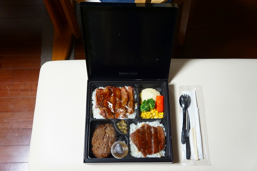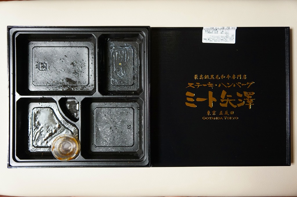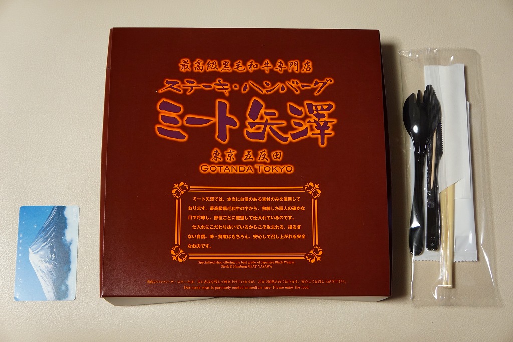2012(平成24)年8月22日にオープンした大丸東京店の地下食料品売り場「お弁当ストリート」のテナント「ミート矢澤」で調製する持ち帰り弁当。店の名を金文字で記す木製風の黒いボール紙容器に詰めた黒いトレーに、サーロインステーキを載せた白御飯、シャトーブリアンステーキを載せた白御飯、黒毛和牛ハンバーグとソースと漬物、コーンとニンジンとブロッコリーとマッシュポテトを並べる。