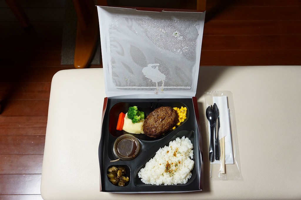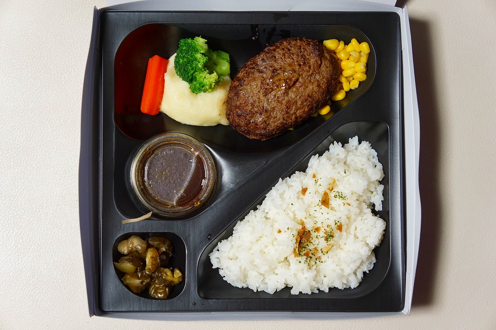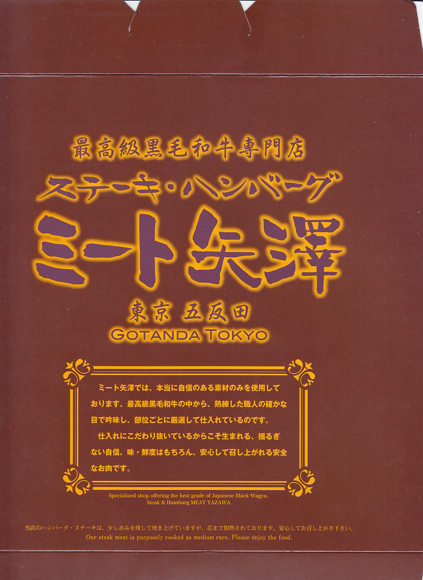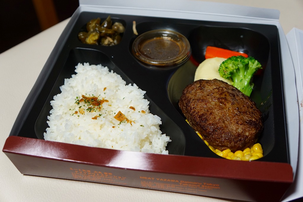 2012(平成24)年8月22日にオープンした大丸東京店の地下食料品売り場「お弁当ストリート」のテナント「ミート矢澤」で調製する持ち帰り弁当。同店専用の大きな紙容器に詰めた黒いトレーに、ニンニクを振りかけた白御飯、ハンバーグ、コーン、ニンジン、ブロッコリー、マッシュポテト、ソース、漬物を、たっぷりの空間に並べていた。和風洋食な美しいハンバーグステーキ。普通に考えると高価だが、この店舗では最も安い弁当であった。